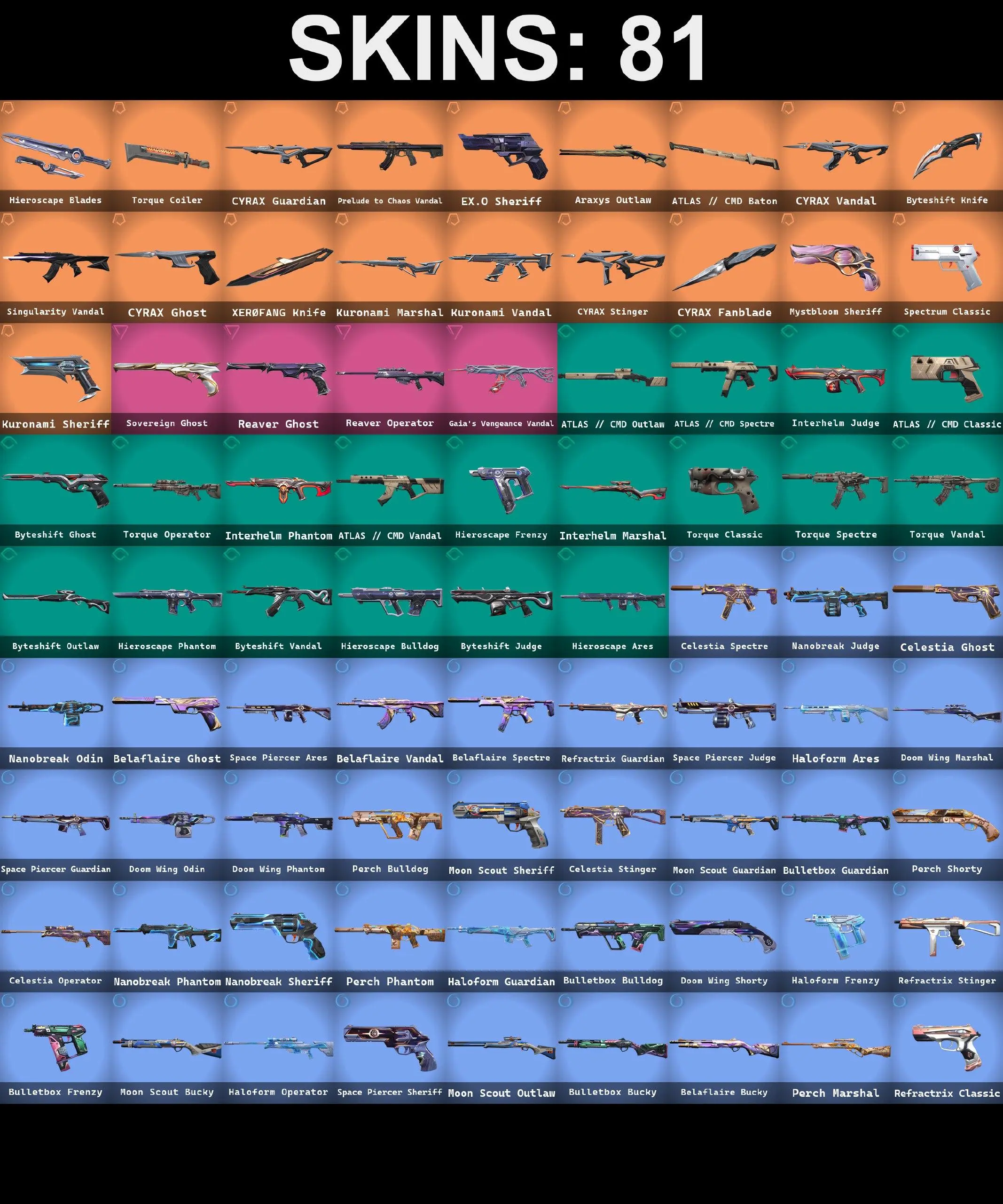 81 SKINS | 6 KNIFE | KURONAMI VANDAL | KURONAMI SHERIFF | KURONAMI MARSHAL | MYSTBLOOM SHERIFF | XERØFANG KNIFE | REAVER OPERATOR | REAVER GHOST | SPECTRUM CLASSIC | SOVEREIGN GHOST | EX.O SHERIFF | SINGULARITY VANDAL | HIEROSCAPE