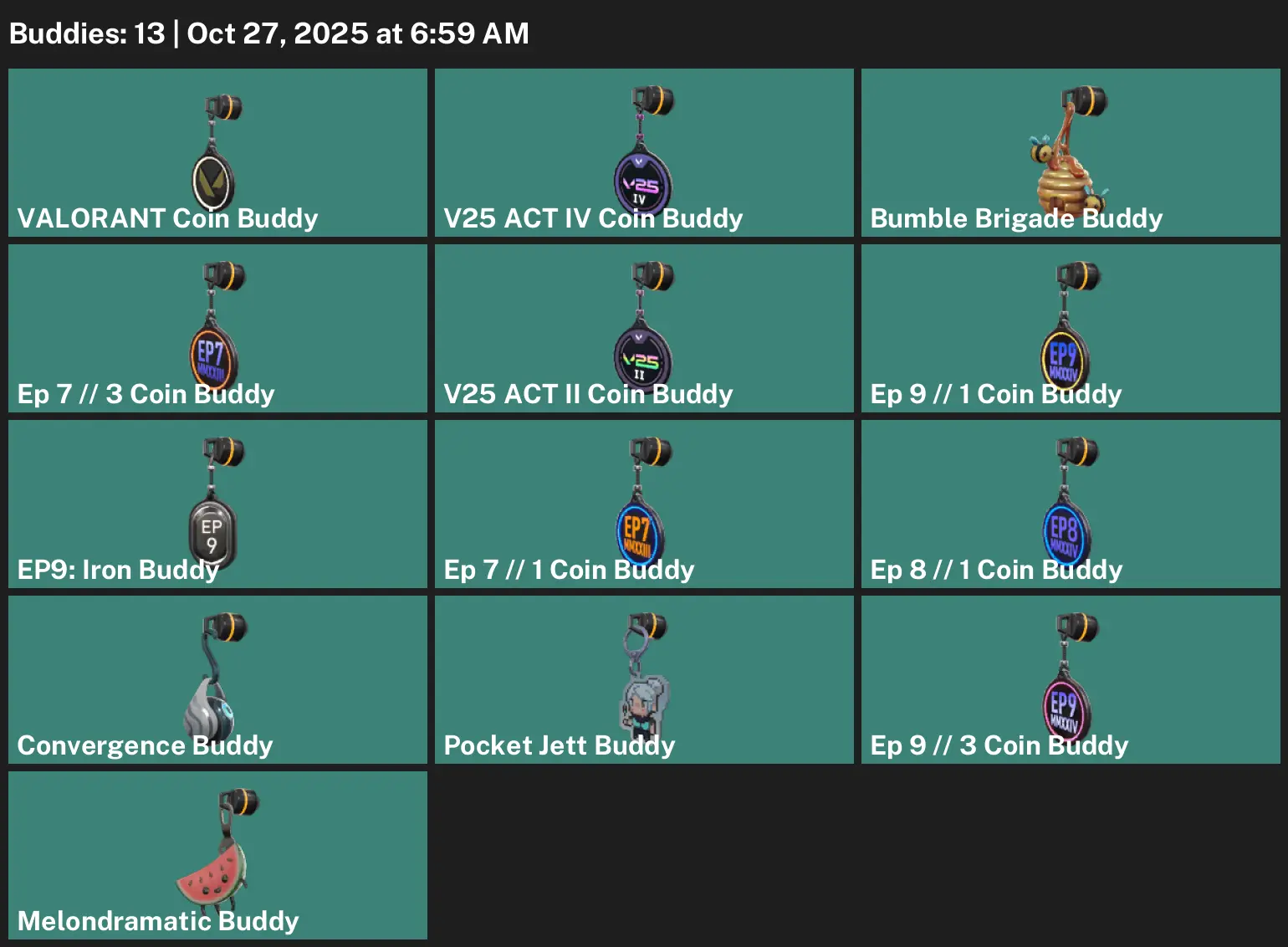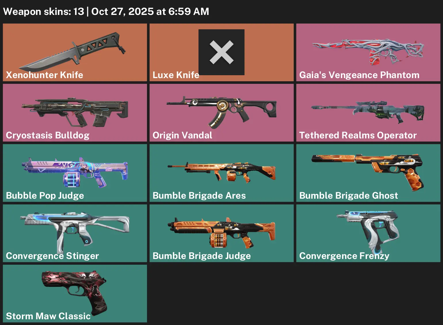 🖊 AP 🎒 Unranked 🤫 13 Skins 🎺 50 VP 🚝 8 Agents 😘 Value: 13275 VP 🔖 Xenohunter Knife 🌒 Luxe Knife 🦙 Gaia's Vengeance Phantom 📊 Cryostasis Bulldog 🏤 Origin Vandal 😷 Tethered Realms Operator