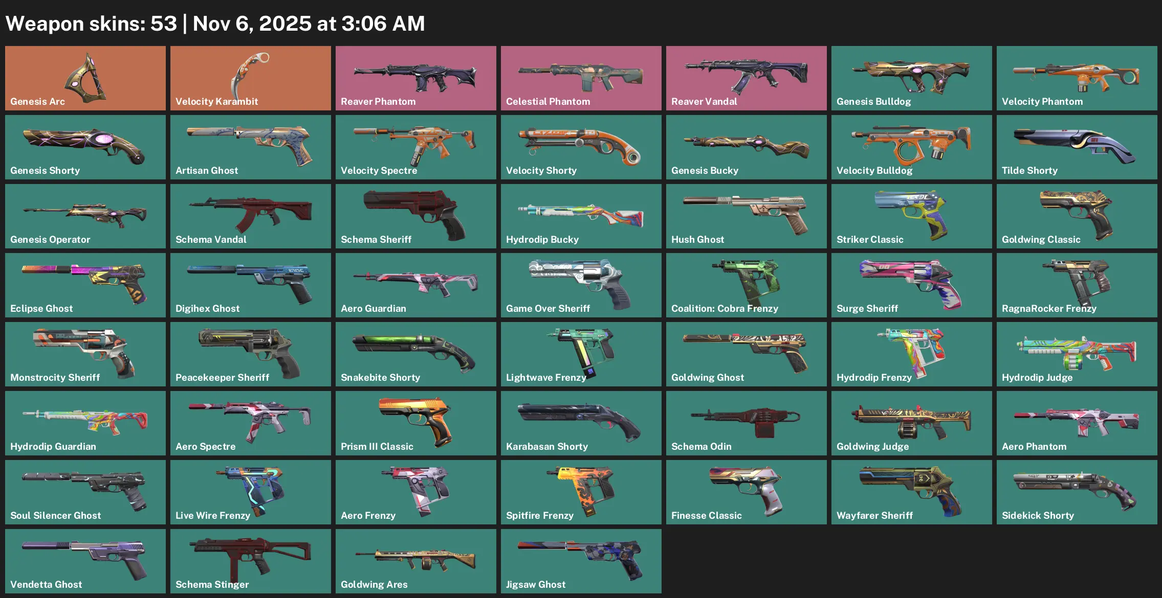 🚞 AP 🍫 Unranked 🥂 53 Skins 🌼 14 VP 🥪 17 Agents 🗺 Value: 5325 VP 🤔 Genesis Arc 😶 Velocity Karambit 📞 Reaver Phantom 🖋 Celestial Phantom 🌑 Reaver Vandal 🫧 Genesis Bulldog