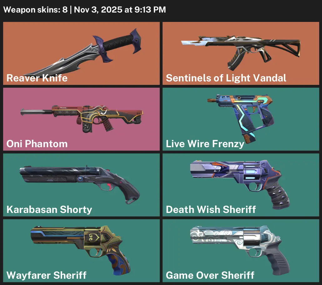 🐕 AP ⛈ Unranked 🧶 8 Skins 🐹 125 VP 🧠 14 Agents 🐊 Value: 7500 VP 🙂↕️ Reaver Knife 🍐 Sentinels of Light Vandal ⚙️ Oni Phantom 🖕 Live Wire Frenzy 🪮 Karabasan Shorty 🧘♀️ Death Wish Sheriff