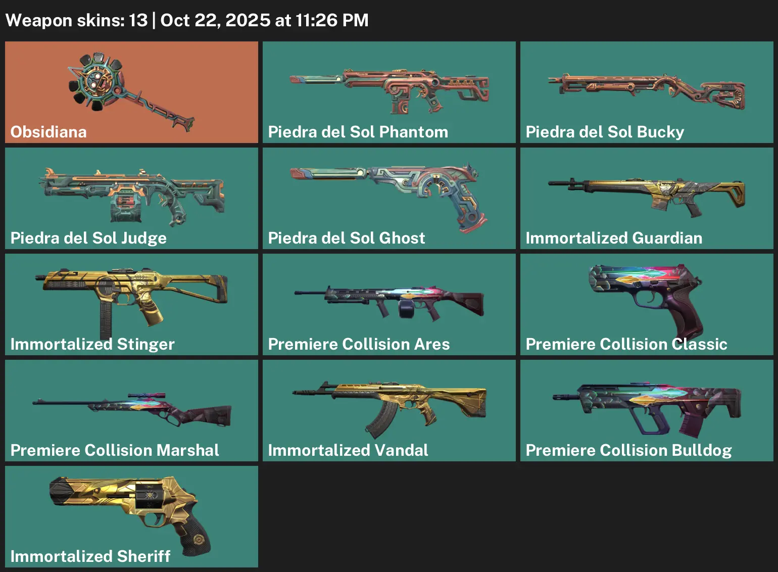 EU | 13 Skins | exp PLATINUM 2 | Immortalized Vandal | Piedra del Sol Phantom | Piedra del Sol Ghost | Obsidiana | Piedra del Sol Bucky | S4G