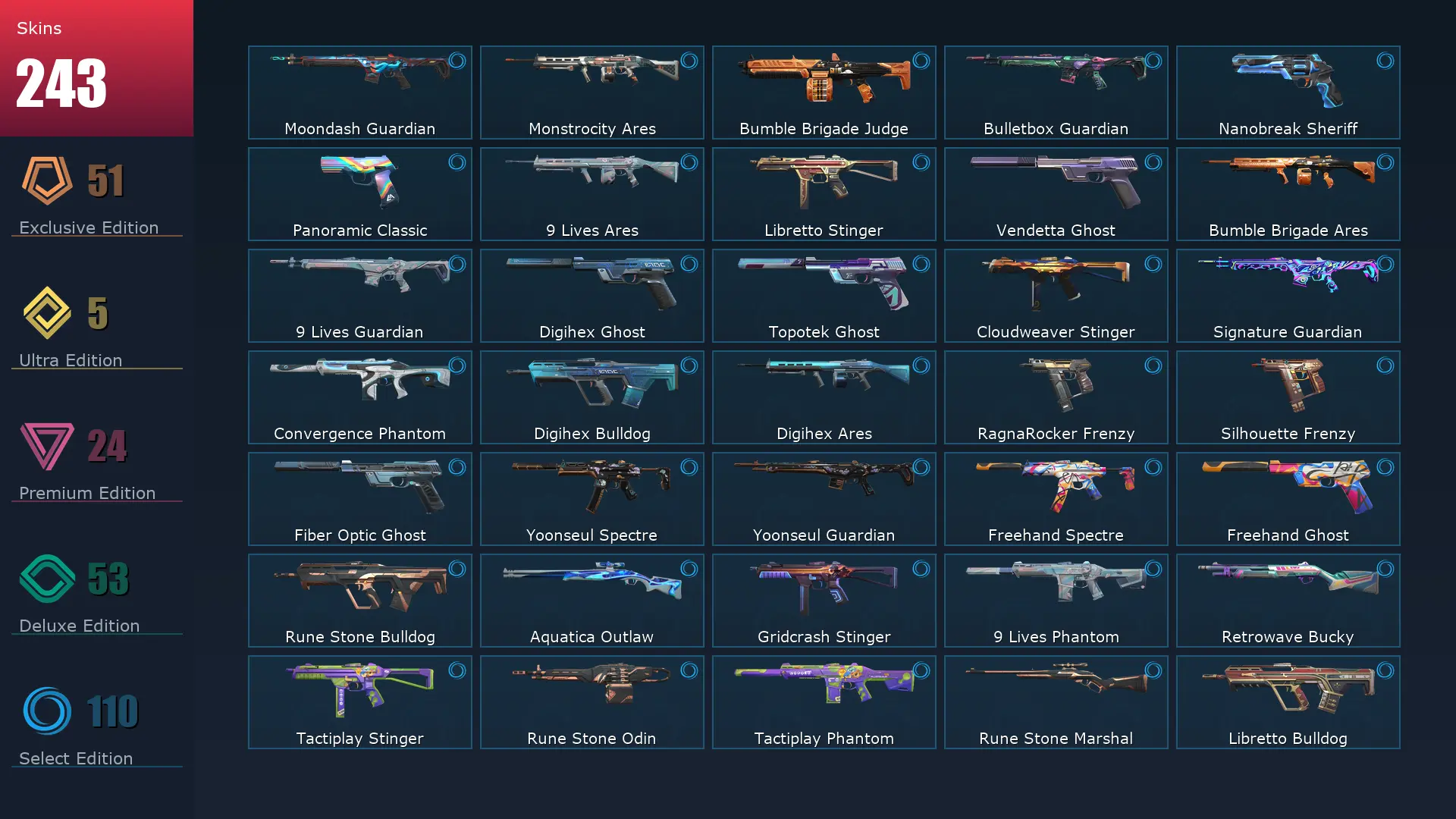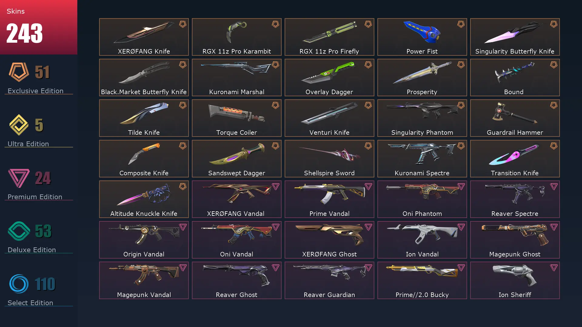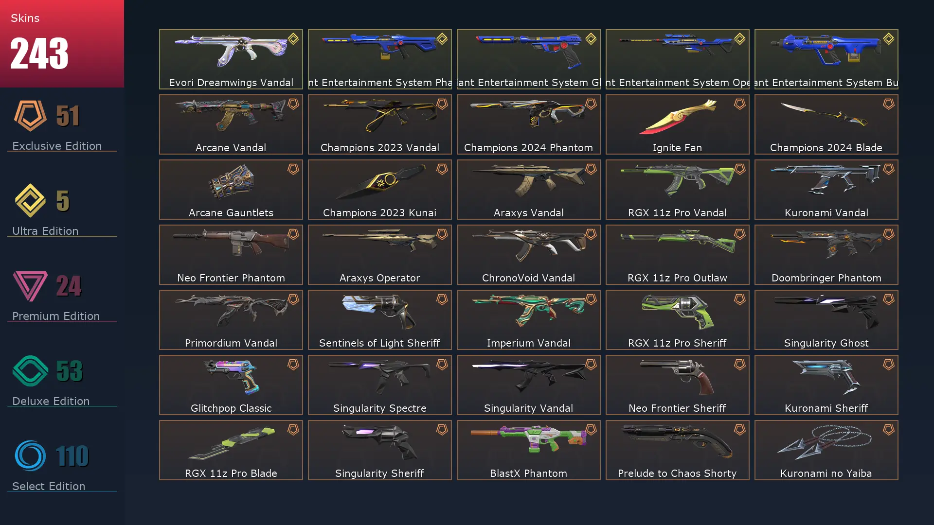 EU 🗒 244 Skins ⚡️ Gold 2 🪐 29 Agents 👕 406 Level 🤿 Arcane Vandal 🧹 Champions 2023 Vandal 🎿 Champions 2024 Phantom 🚵♀️ Ignite Fan 🐌 Champions 2024 Blade 🌭 Arcane Gauntlets 🍶 Champions 2023 Kunai 🎡 Reaver Guardian 🌜 XERØFANG Vandal