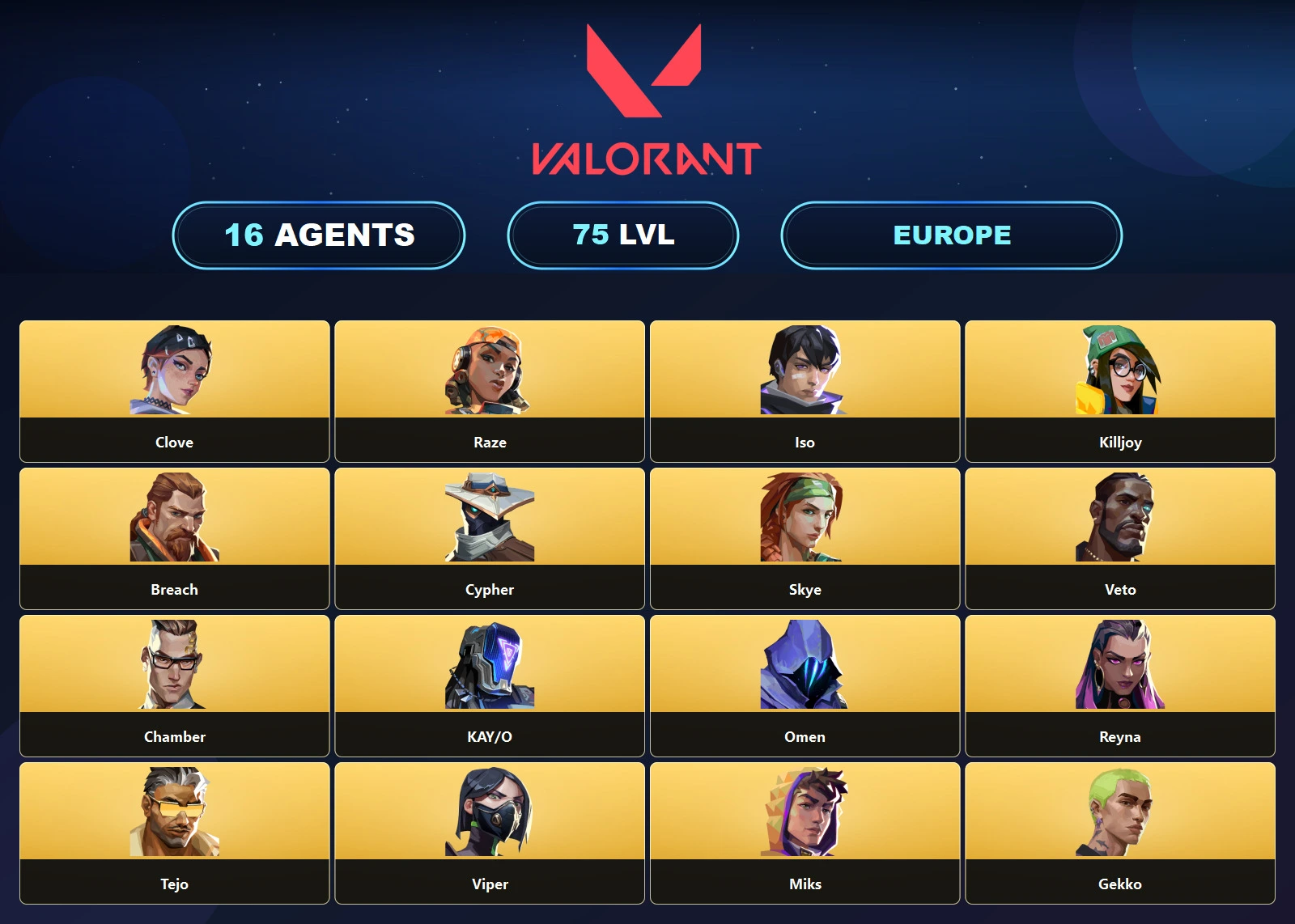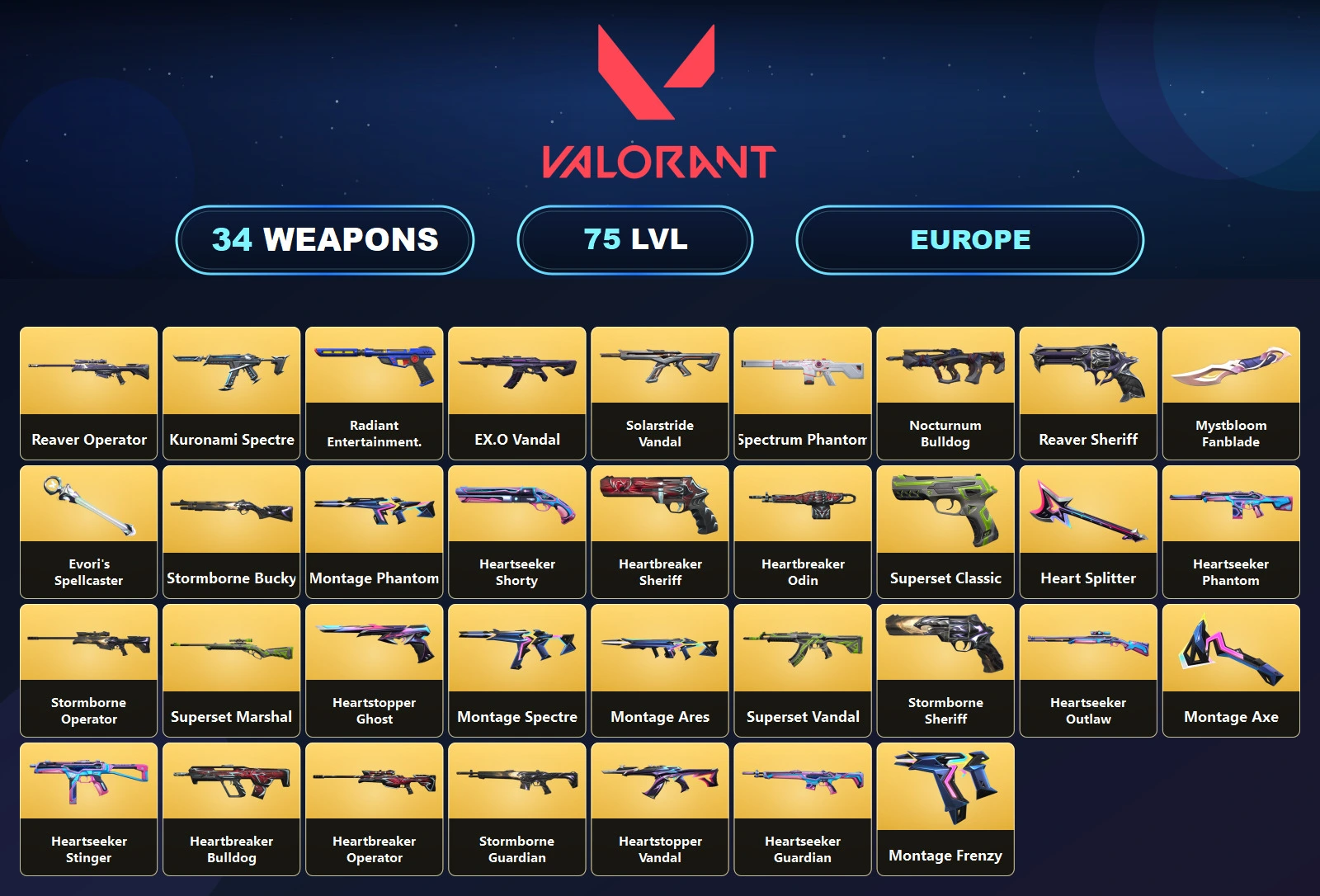 EU 🎯 34 Skins 🍒 75 Level ⛈ Spectrum Phantom 🥪 Kuronami Spectre 🪐 Reaver Operator 🐩 Reaver Sheriff 🏁 Mystbloom Fanblade 🎪 EX.O Vandal 🪙 Solarstride Vandal 🧊 Gold 1 🔥 16 Agents