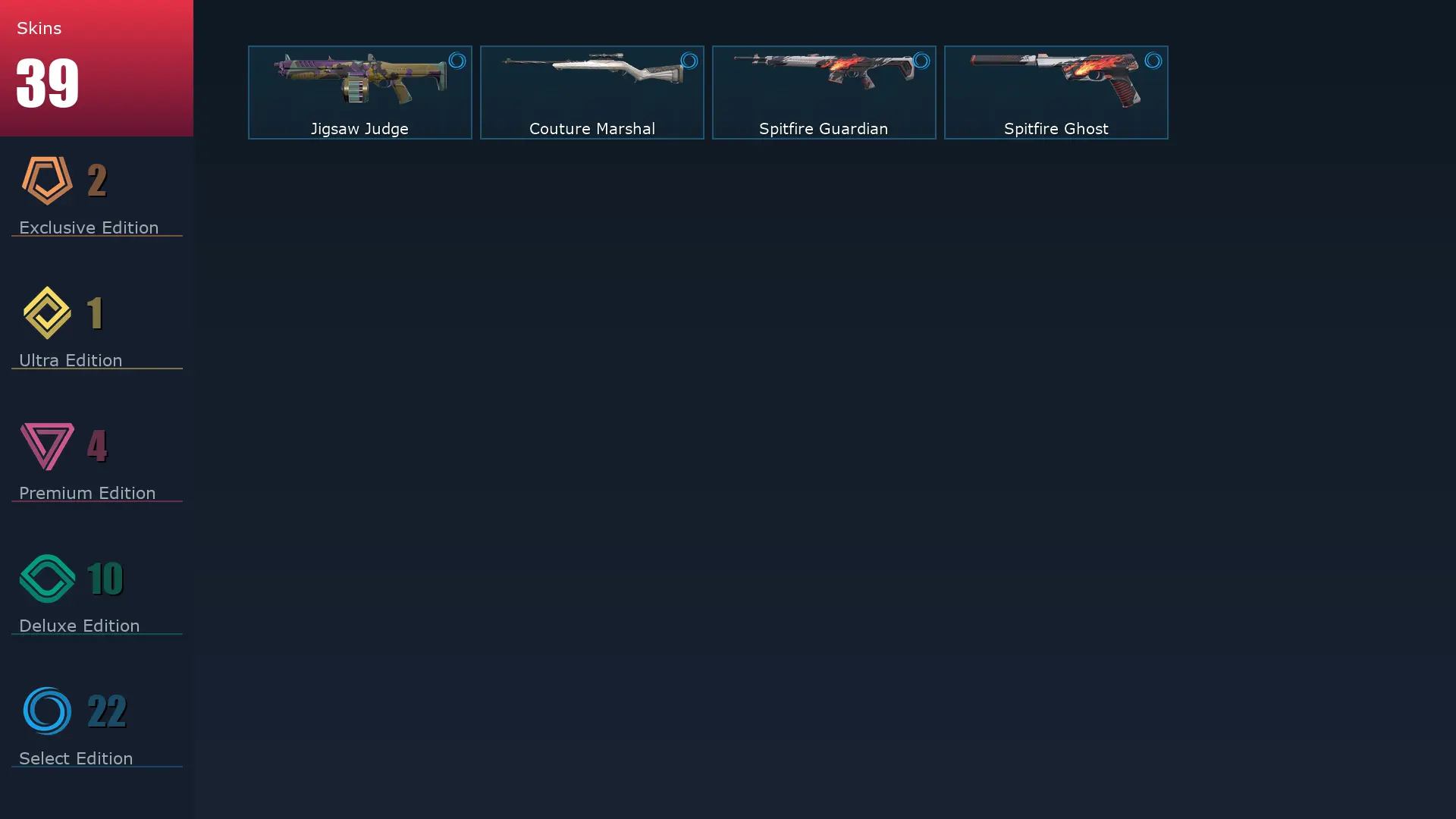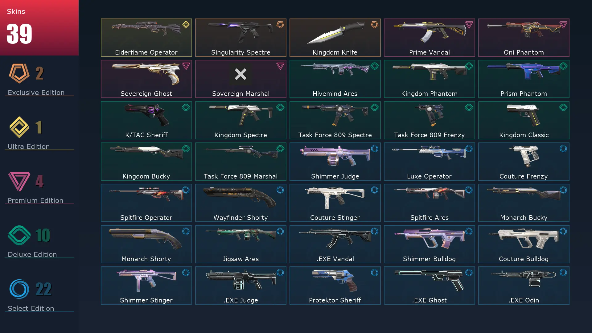 EU ⚔️ 39 Skins 🎑 Diamond 1 🎨 24 Agents 😵💫 62 Level 🌼 Sovereign Marshal 🚚 Elderflame Operator 🛍 Prime Vandal 🐪 Shimmer Judge 🦠 Sovereign Ghost 📃 Oni Phantom 🍅 Singularity Spectre