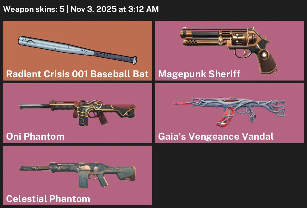 🍓 EU 😸 Unranked ☝️ 5 Skins 🌽 229 VP 🐊 10 Agents 🌮 Value: 10650 VP 🫲 Radiant Crisis 001 Baseball Bat 🕌 Magepunk Sheriff 🖌 Oni Phantom 💼 Gaia's Vengeance Vandal 🌽 Celestial Phantom