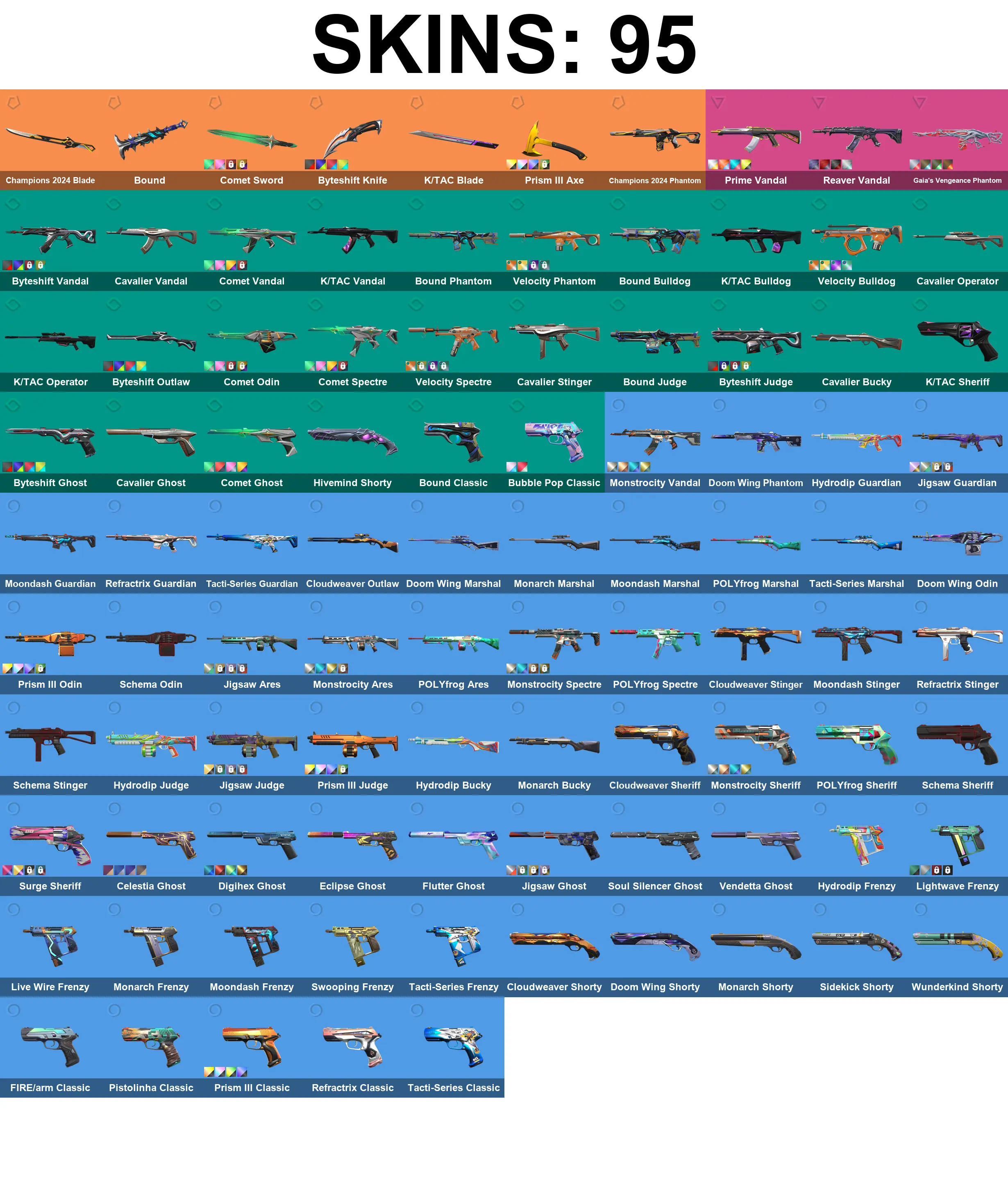 LATAM | 95 Skins + 6 Knives | Champions 2024 Blade | Bound | Comet Sword | Byteshift Knife | K/TAC Blade | Prism III Axe | Champions 2024 Phantom | Prime Vandal | Reaver Vandal | 2x Bronze Buddy + 6x Silver Buddy + 6x Gold Buddy