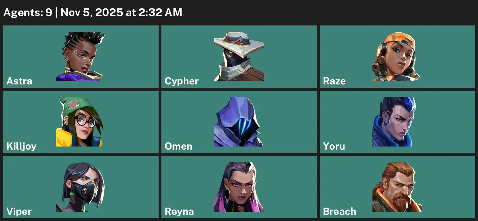 ⏲ NA 🏩 Unranked 🍃 1 Skins 🌦 275 VP 🥹 9 Agents 💅 Value: 1775 VP 🏐 Spline Phantom