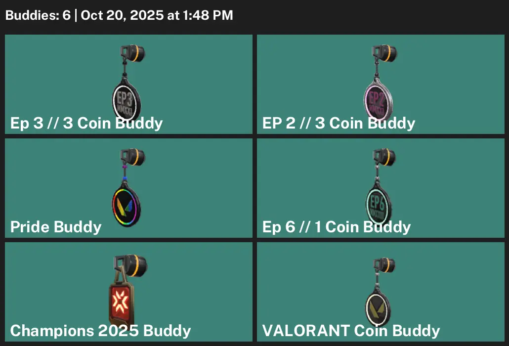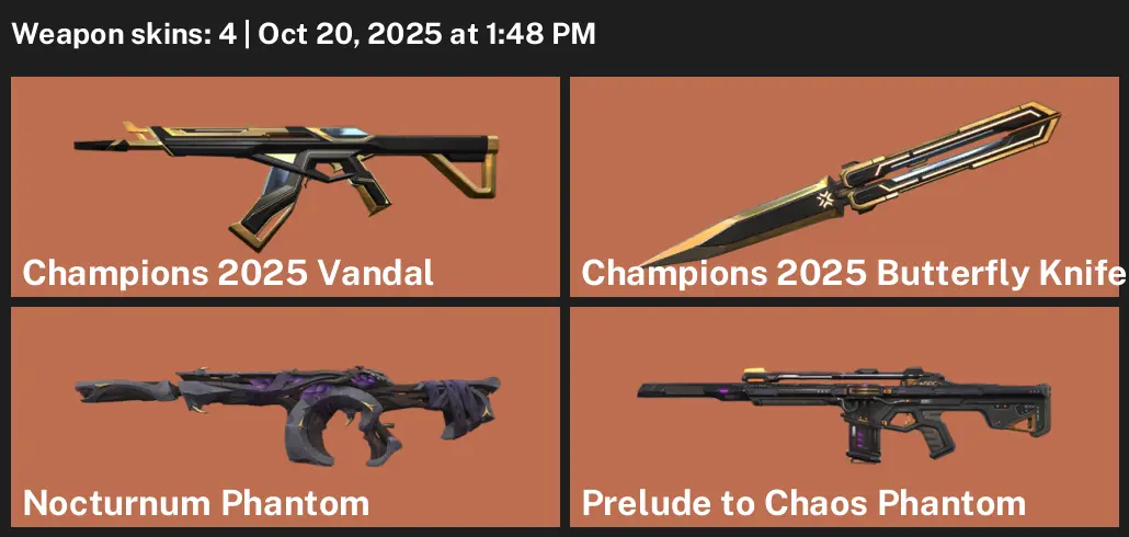 🥊 NA 🔖 Unranked 👣 4 Skins 🪙 10 VP 🪮 2 Agents 👢 Value: 12375 VP 🌱 Champions 2025 Vandal 🦯 Champions 2025 Butterfly Knife 🌞 Nocturnum Phantom 🥈 Prelude to Chaos Phantom