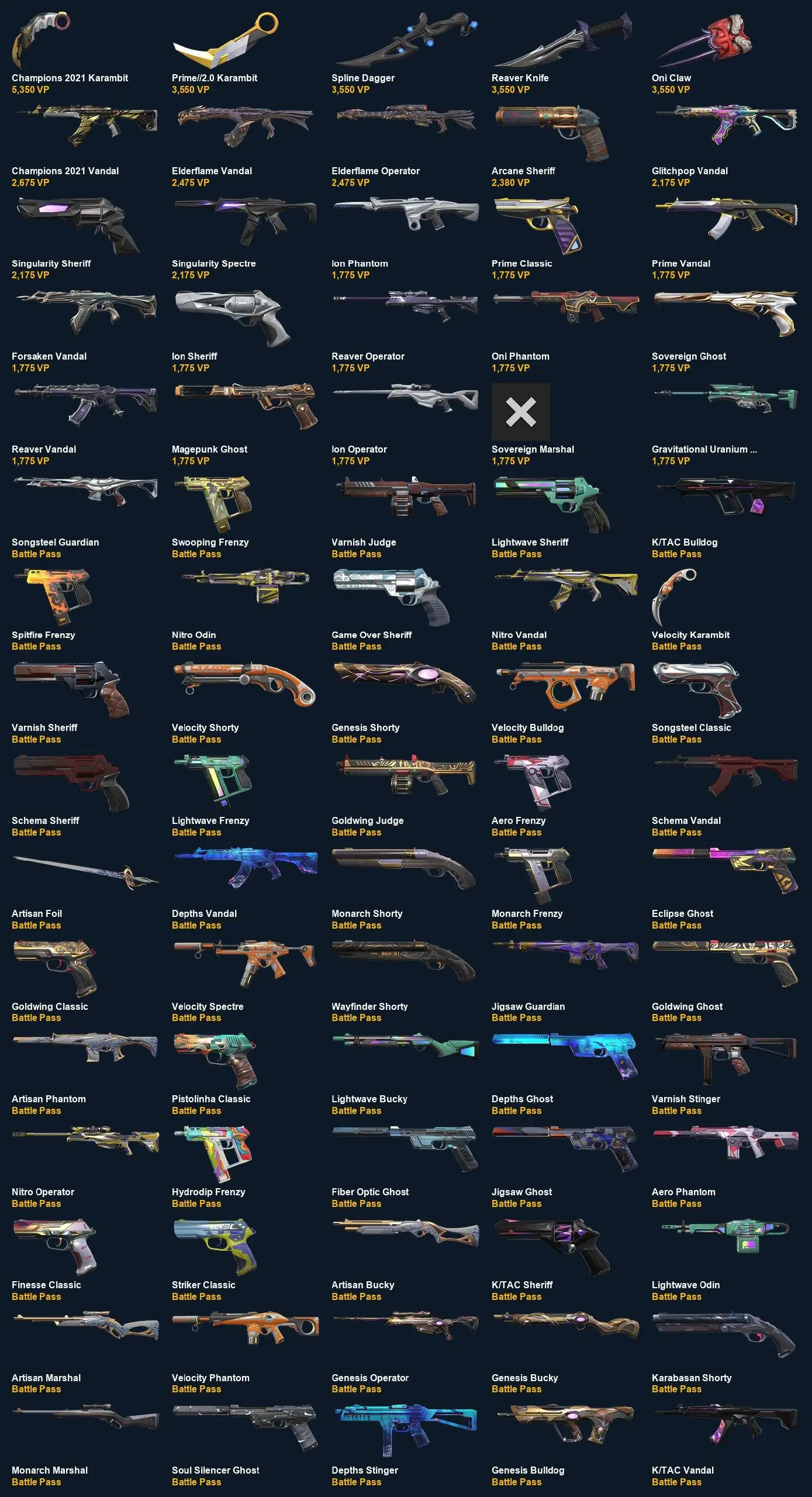Champions 2021 Karambit, Prime//2.0 Karambit, Spline Dagger, Reaver Knife, Oni Claw, Champions 2021 Vandal, Elderflame Vandal, Elderflame Operator, Arcane Sheriff, Glitchpop Vandal, Singularity Sheriff, Singularity Spectre, Ion Phantom, Prime Classic, Prime Vandal, Forsaken Vandal, Ion Sheriff, Reaver Operator, Oni Phantom, Sovereign Ghost, Reaver Vandal, Magepunk Ghost, Ion Operator, Sovereign Marshal, Gravitational Uranium Neuroblaster Operator, Songsteel Guardian, Swooping Frenzy, Varnish Judge, Lightwave Sheriff, K/TAC Bulldog, Spitfire Frenzy, Nitro Odin, Game Over Sheriff, Nitro Vandal, Velocity Karambit, Varnish Sheriff, Velocity Shorty, Genesis Shorty, Velocity Bulldog, Songsteel Classic, Schema Sheriff, Lightwave Frenzy, Goldwing Judge, Aero Frenzy, Schema Vandal, Artisan Foil, Depths Vandal, Monarch Shorty, Monarch Frenzy, Eclipse Ghost, Goldwing Classic, Velocity Spectre, Wayfinder Shorty, Jigsaw Guardian, Goldwing Ghost, Artisan Phantom, Pistolinha Classic, Lightwave Bucky, Depths Ghost, Varnish Stinger, Nitro Operator, Hydrodip Frenzy, Fiber Optic Ghost, Jigsaw Ghost, Aero Phantom, Finesse Classic, Striker Classic, Artisan Bucky, K/TAC Sheriff, Lightwave Odin, Artisan Marshal, Velocity Phantom, Genesis Operator, Genesis Bucky, Karabasan Shorty, Monarch Marshal, Soul Silencer Ghost, Depths Stinger, Genesis Bulldog, K/TAC Vandal, Schema Odin, Aero Spectre, Aero Guardian, Artisan Ghost, Jigsaw Judge, Coalition: Cobra Frenzy, Varnish Bulldog, Nitro Guardian, Hydrodip Guardian, Hydrodip Judge, Jigsaw Ares, Hydrodip Bucky, Genesis Arc, Songsteel Marshal, Schema Stinger, Depths Bulldog, K/TAC Operator, Goldwing Ares, Lightwave Phantom, K/TAC Blade, Songsteel, Monarch Bucky