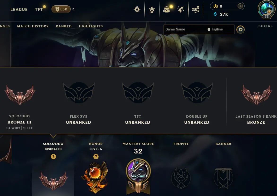 ๐ค BRONZE III EUW | ๐งญ Lvl 35 | ๐ฐ 27K BE | ๐งโโ๏ธ 45 Champs | ๐