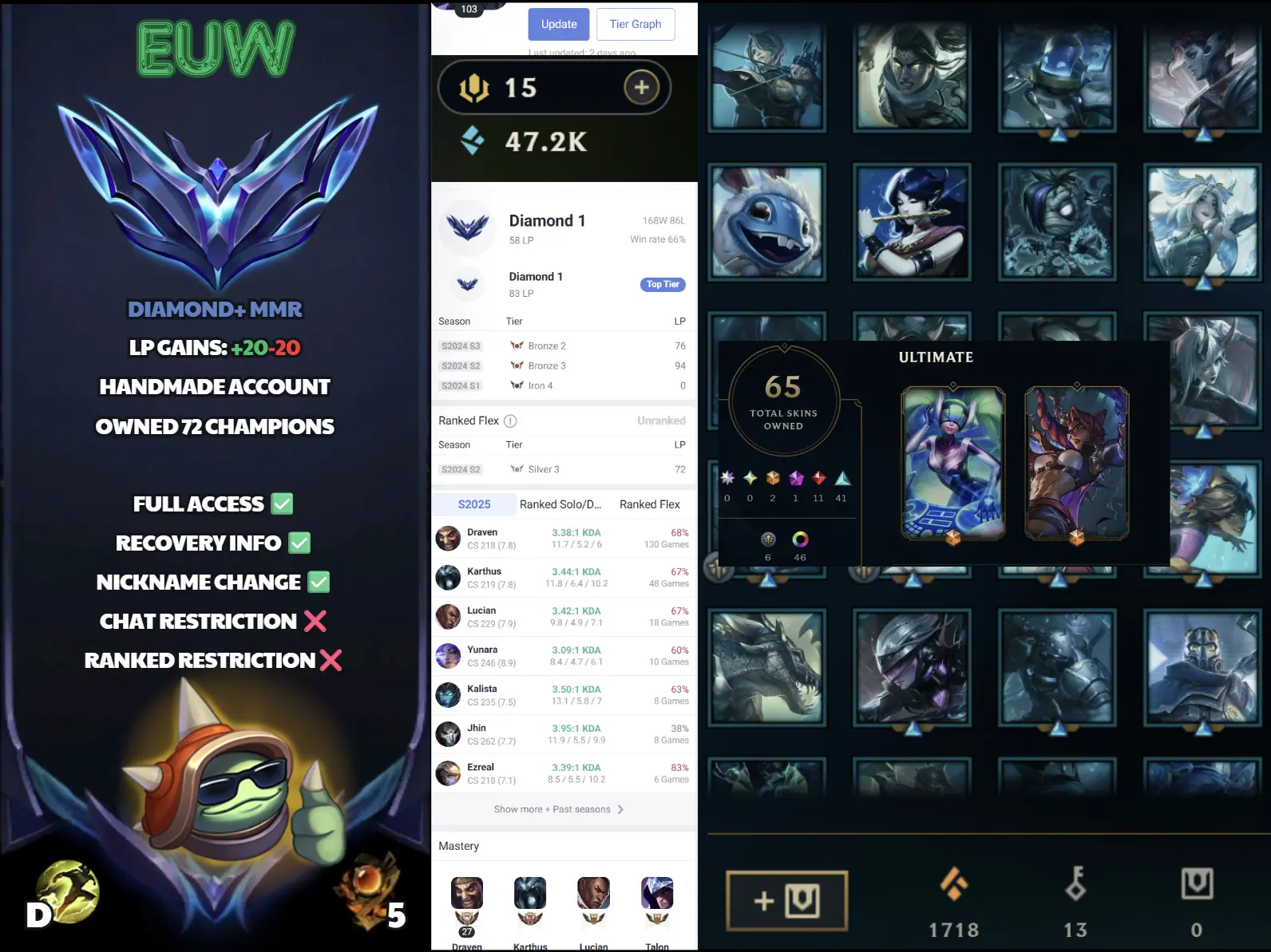 🌍 EUW 🔒 Handlevel ⚡ Diamond I (58 LP) ✨ WR:66% 🔥 65 Skins ♾️ Lifetime Ownership 📧 Full Access Account ✅ #SBL-N3A