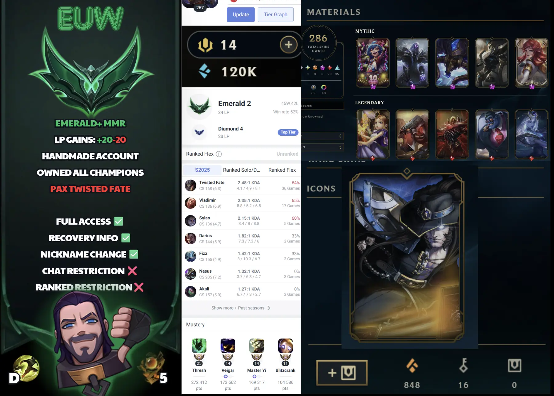 ๐ EUW ๐ Handlevel โก Emerald II (34 LP)โจ PAX Twisted Fate ๐ฅ 286 Skins โพ๏ธ Lifetime Ownership ๐ง Full Email Access โ