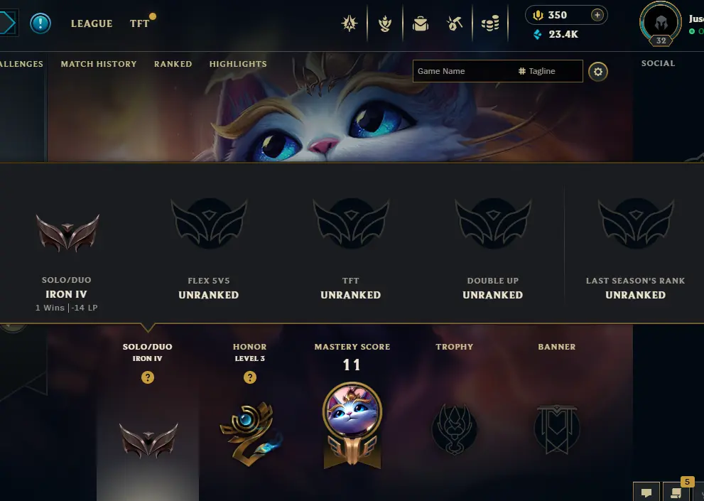 ⚡ 【 ME 】 ⸱ Iron IV 21.2% WR +11Games ⚡ | Hand ⸱ ( leveled + De-ranked ✌️ ) | Unverified ✅ | 23489 BE 💵 | 350 RP 💰 | Untouched-Loot 🔒 | Check Description 🔰