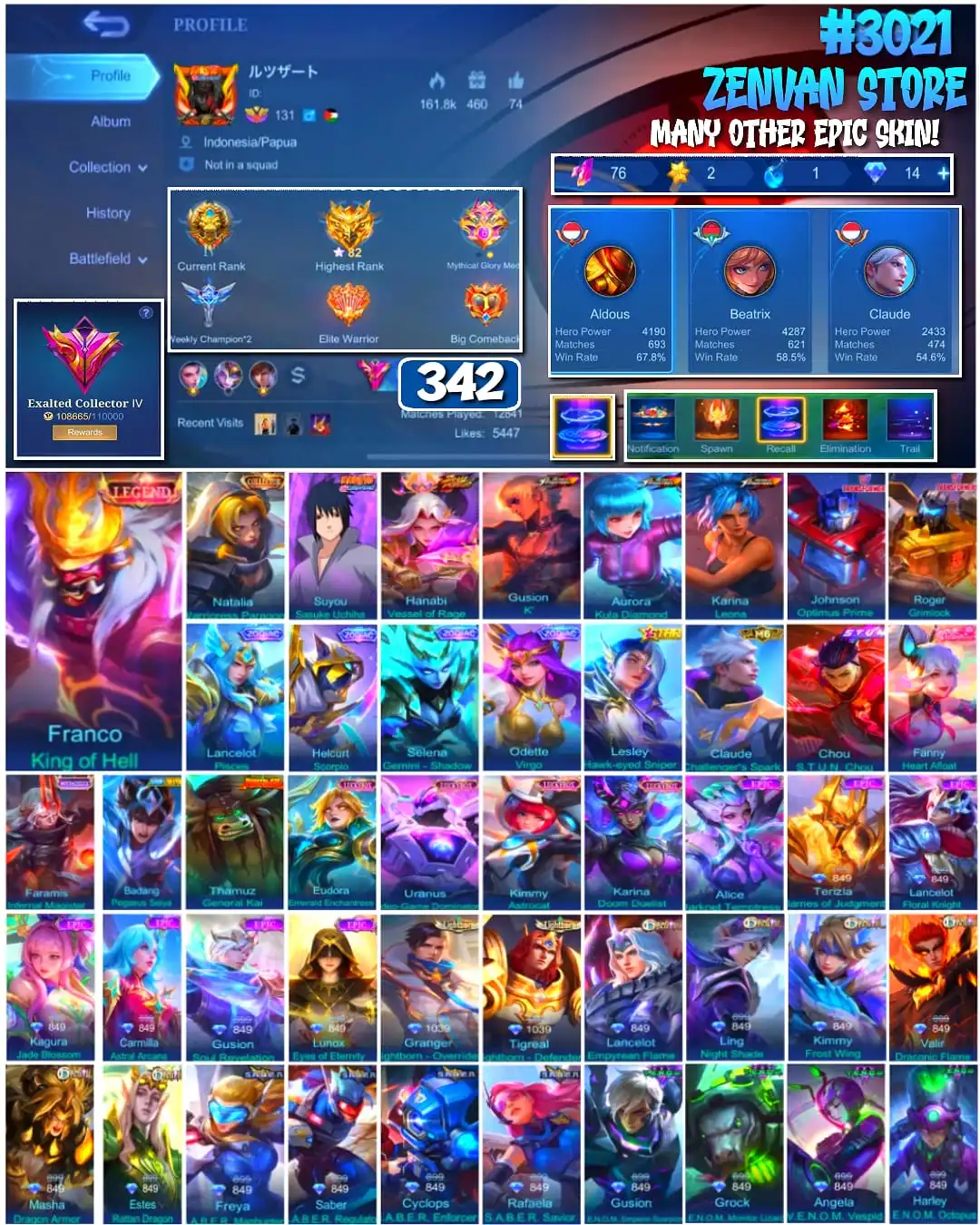 #3021 ๐ฅ 342 Skins ๐ฅ Legend Franco ๐ฅ Collector Natalia ๐ฅ Sasuke ๐ฅ Soul Vessels Hanabi ๐ฅ Transformers Johnson & Roger ๐ฅ Stun Chou ๐ฅ KoF Gusion, Karina, Aurora ๐ฅ Many Limited ๐ฅ Many Zodiak ๐ฅ Many Epic ๐ฅ Safe Account โ