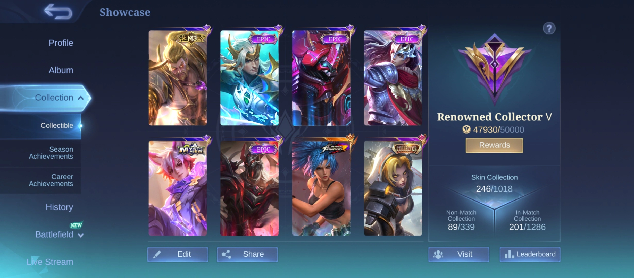 GG828|Lvl 107|RENOWNED CC 5|ALL EMBLEM MAX|246 SKIN|130 HEROES MAX|KARINA KOF|6 EPIC SKIN|ROGER M3|JULIAN MEOWKIN|LESLEY MEOWKIN|EPIC 2