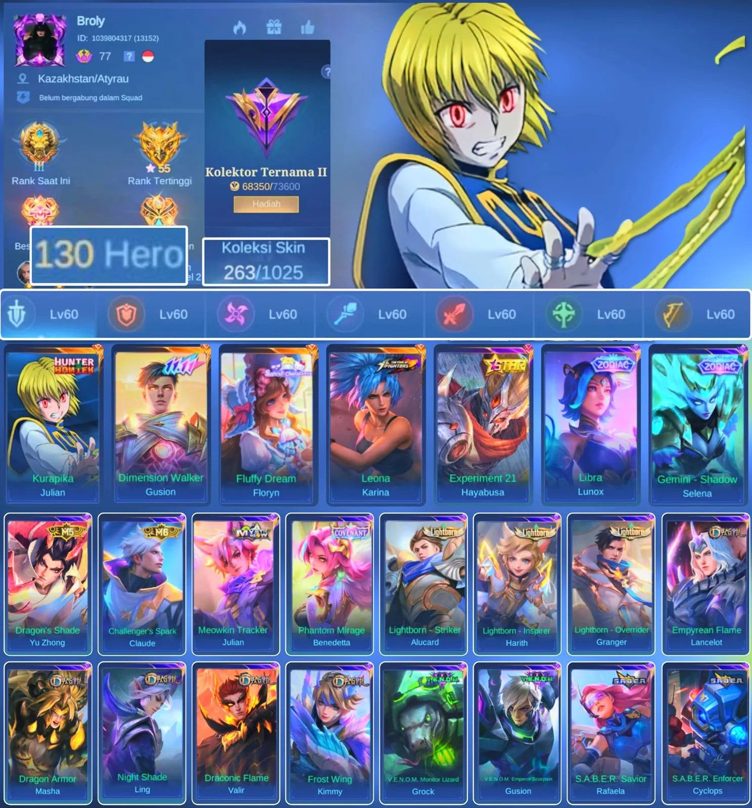 HERO 130 SKIN 263 | EMBLEM ALL MAX | HUNTER JULIAN | DIMENSION GUSION | FLUFYY DREAM | ZODIACK LUNOX | HERO GOOD | SKIN GOOD | INSTAN DELIVERY