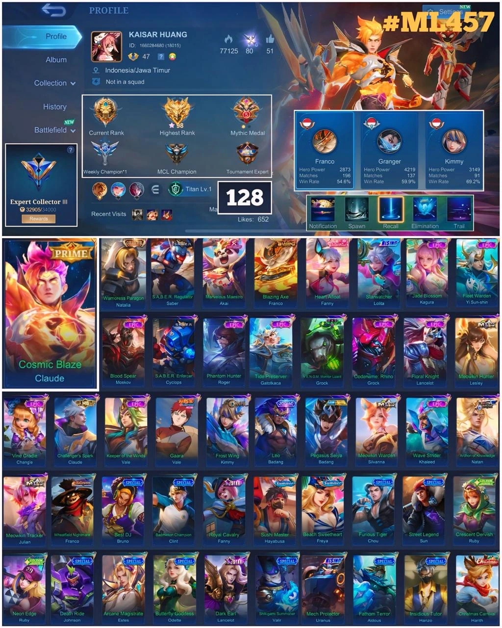 ML 457⚡️Skins 128⚡️Hero 77⚡️Prime Claude⚡️Collector Natalia⚡️Saber⚡️Blazing Franco⚡️Valentine Fanny⚡️Rising Lolita⚡️10 Epic⚡️Venom Grock⚡️Mystic Lesley⚡️M6 Claude⚡️Naruto Vale⚡️Dragon Kimmy⚡️ Zodiac Seint Badang⚡️