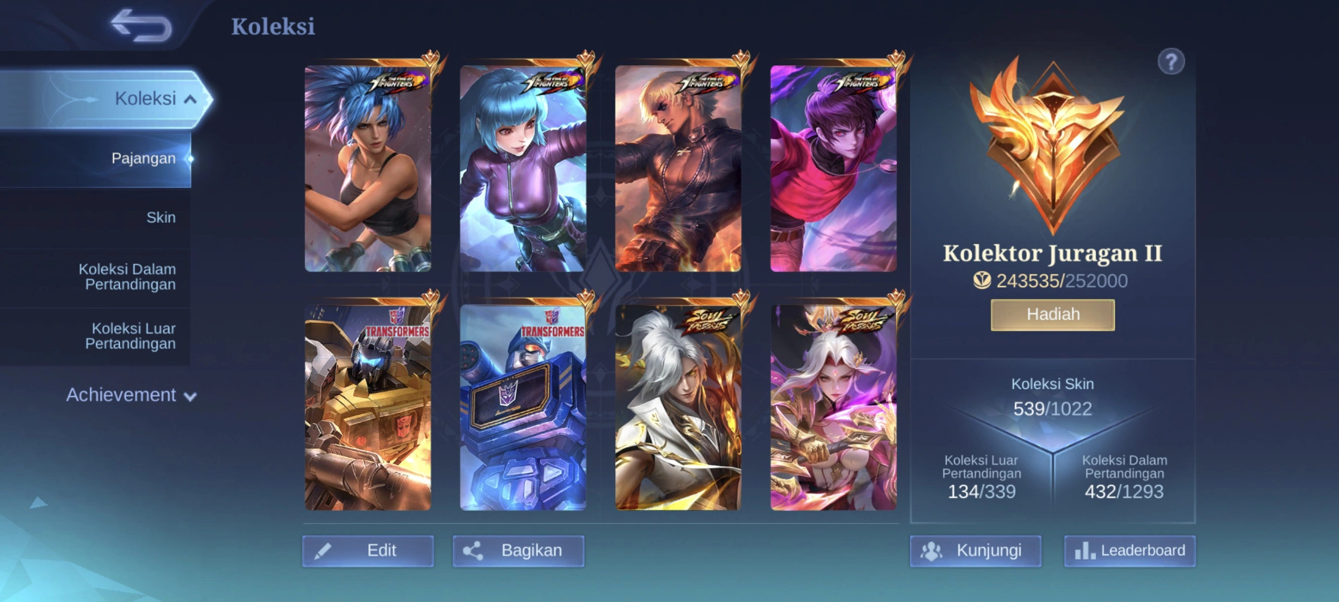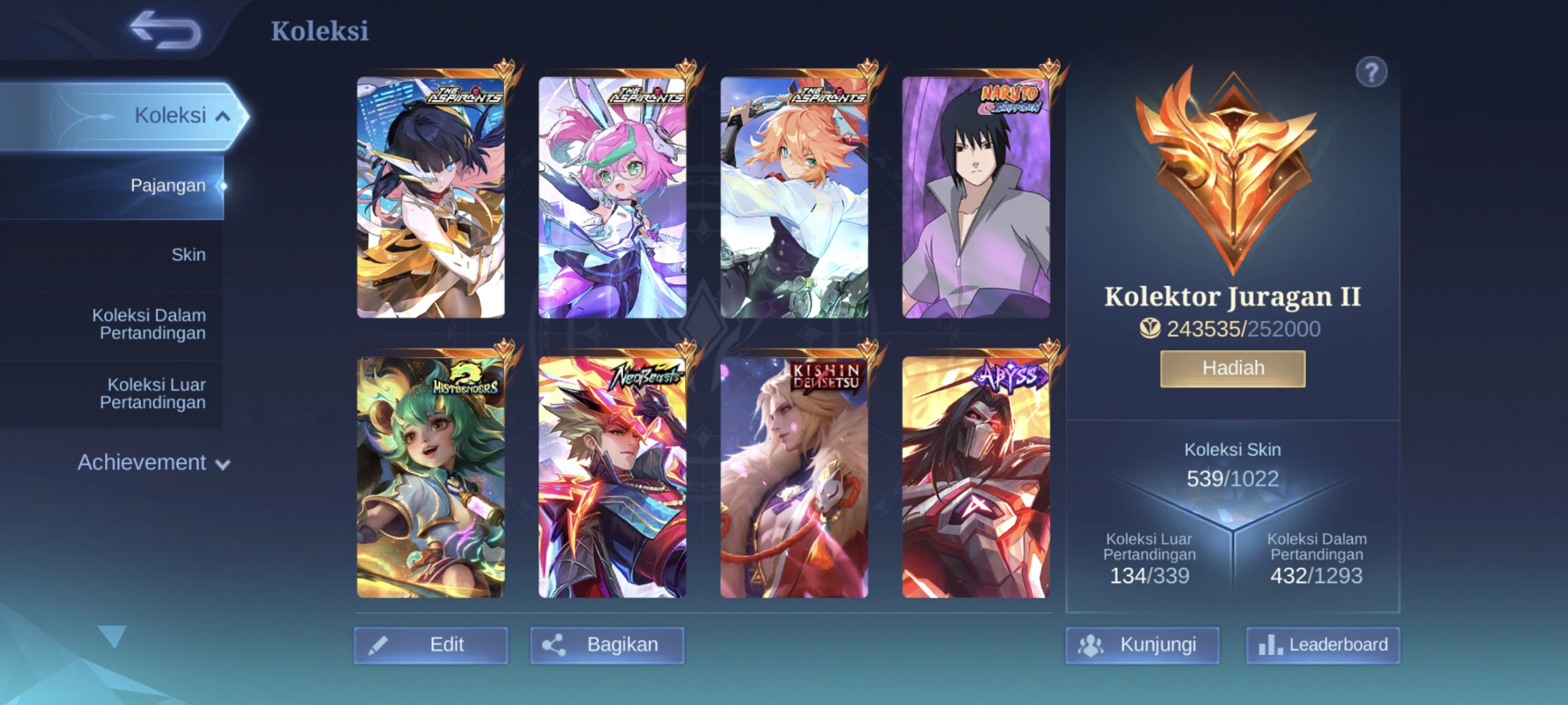 MM296|Lv107|539Skin|MEGACOLLECTORII|3LEGEND|MISTBENDERS Nana|4KOF|METROZERO Roger|FULLSOULVESSELS|ABYSS Moskov|KISHIN Lancelot|3ASPIRANTS|NARUTO Suyou|2COLLECTOR