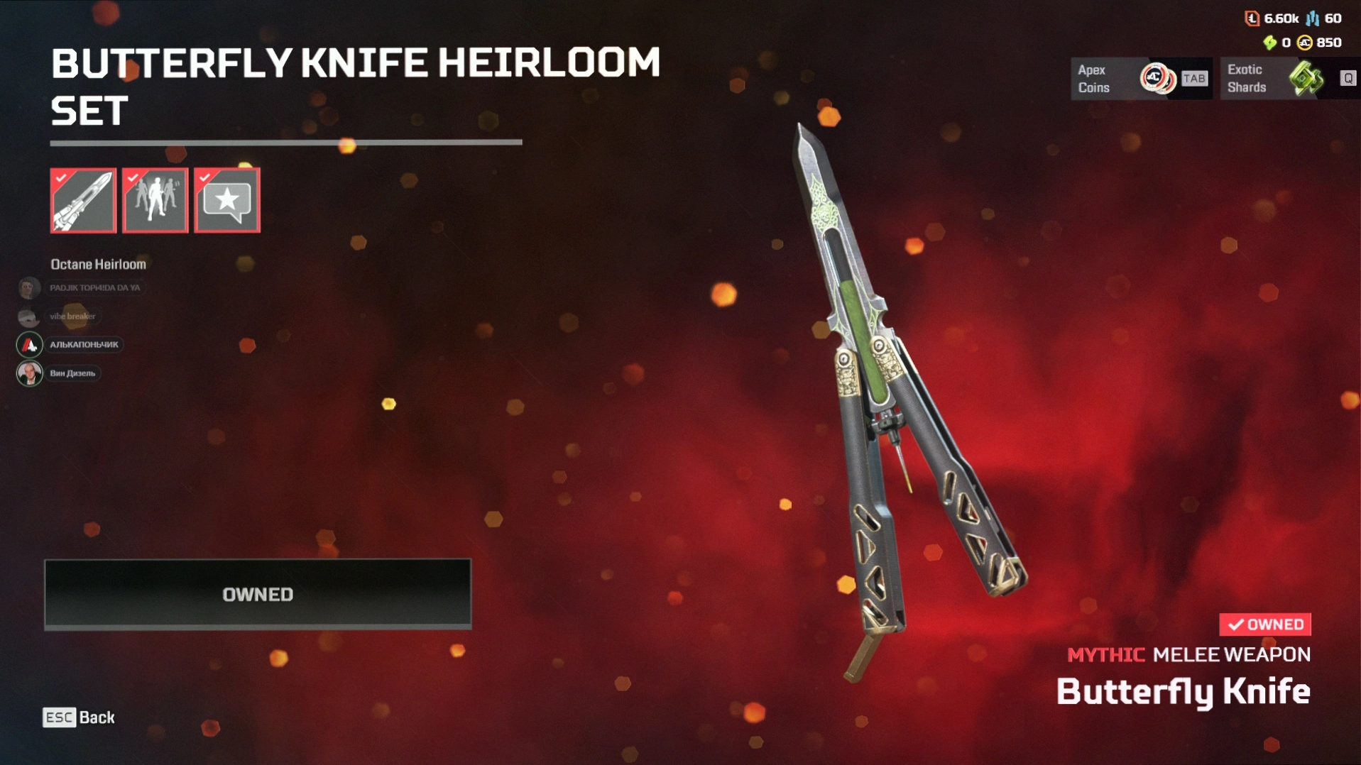 HEIRLOOM Octane (Butterfly Knife)+42 LEGENDARY ITEMS+18 LEGENDS+6600 LT+233 LVL+2160 Matches+PLATINUM 12 Season+Badges+Other Things ⸱ EA #CODE-160649