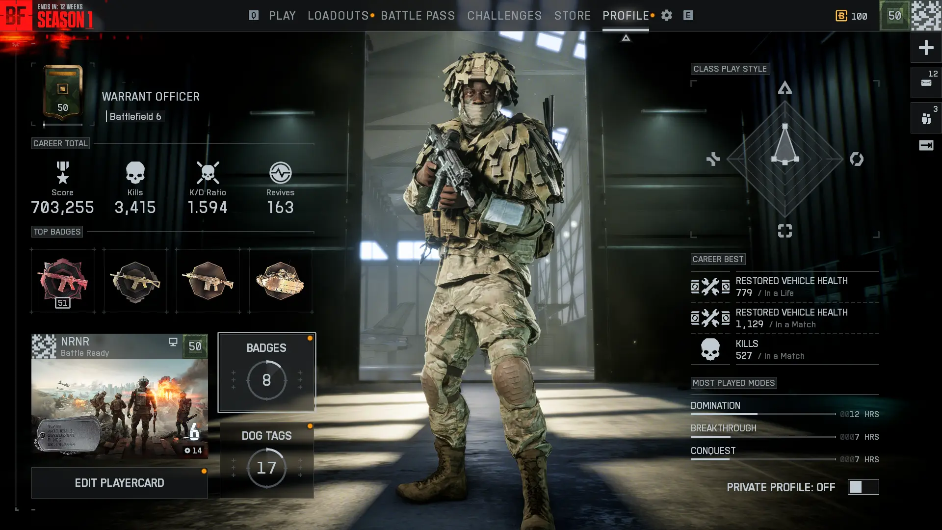 [ Battlefield 6 ] โญ Rank 50 + ๐ฃ 35 Gun Unlocked ๐ฅ 1 Max level gun ( mastery 50 ) ๐ 9 Bronze + 2 Gold Badge ๐ซ 2 camos ๐ฅ 15 TOTAL DOG TAGS Full access ๐ชฝ Come With Ea pro๐ Handmade No cheats ๐ฅ