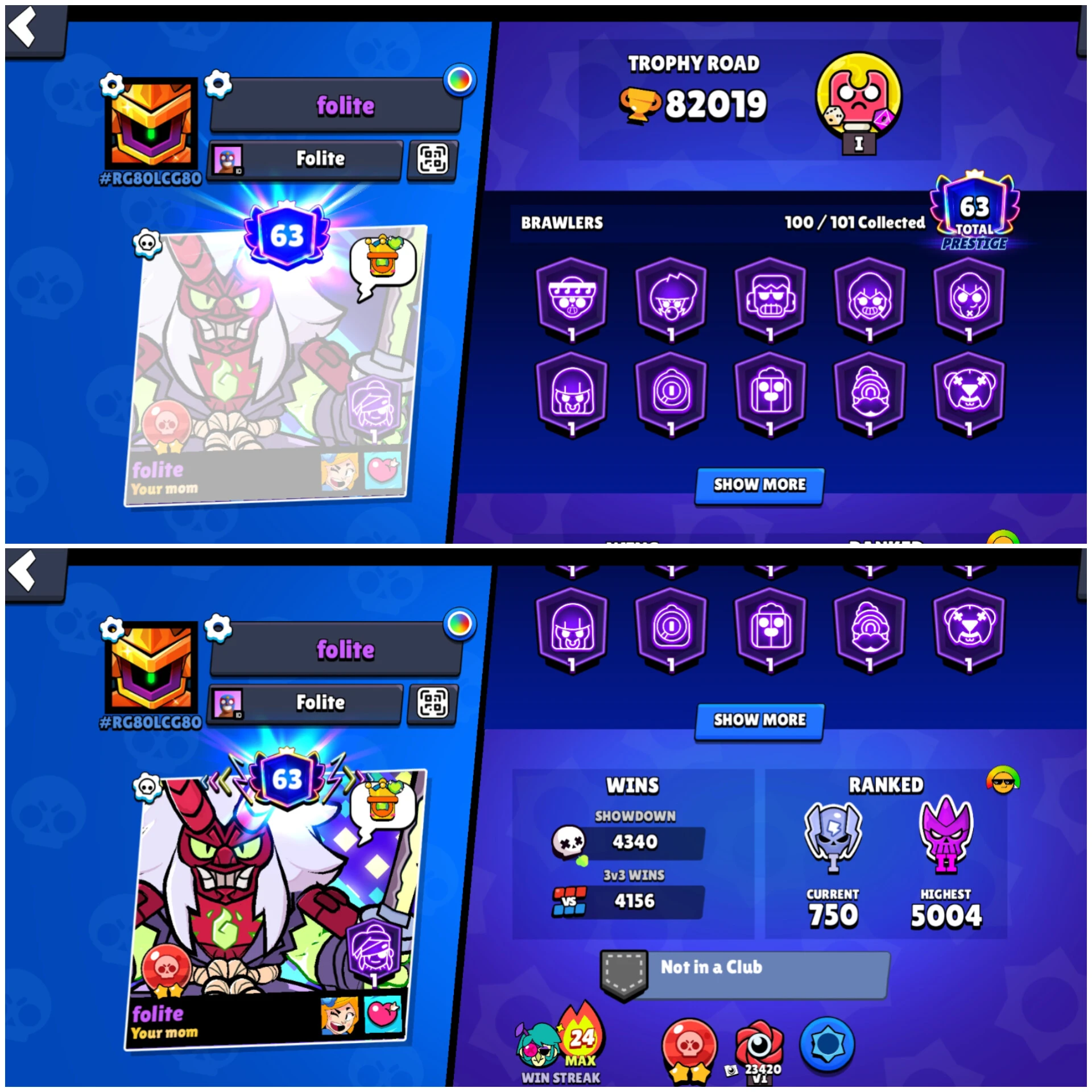 100 brawler | 82000 Trophy | 39 Max Brawler | 37 Haypercharge | 325 skin | 63 prestige| 82k trophy