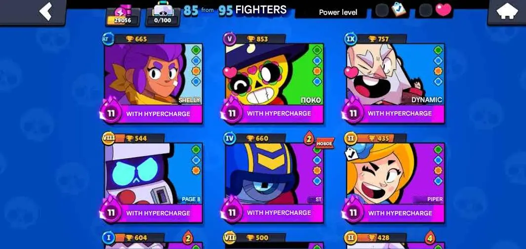 BS1488 29056 cups, 85 of 95 fighters, 149 skins, 17 characters at power level 11 (11 hypercharged), Squad Busters Shelly, Arunabob, Arrested, Rafina Piner Vanara Frank Supreme,