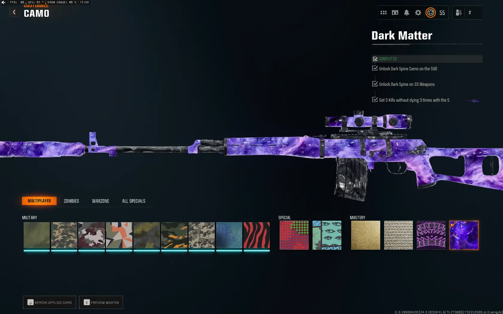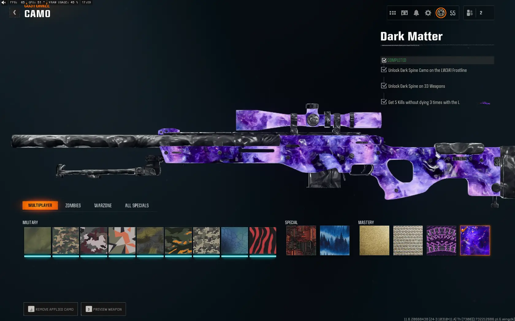 【🦂 Black Ops 6 🦂】【 Dark Matter Legit Unlocked + Prestige 1 】 ⚔ All Multiplayer Camos Unlocked ✨ Prestige 1 Ready ⚡ Dark Matter Legit Unlocked on all 33 Black Ops 6 Guns ☄ Linkable to STEAM / BNET / XBOX / PSN #ZB541