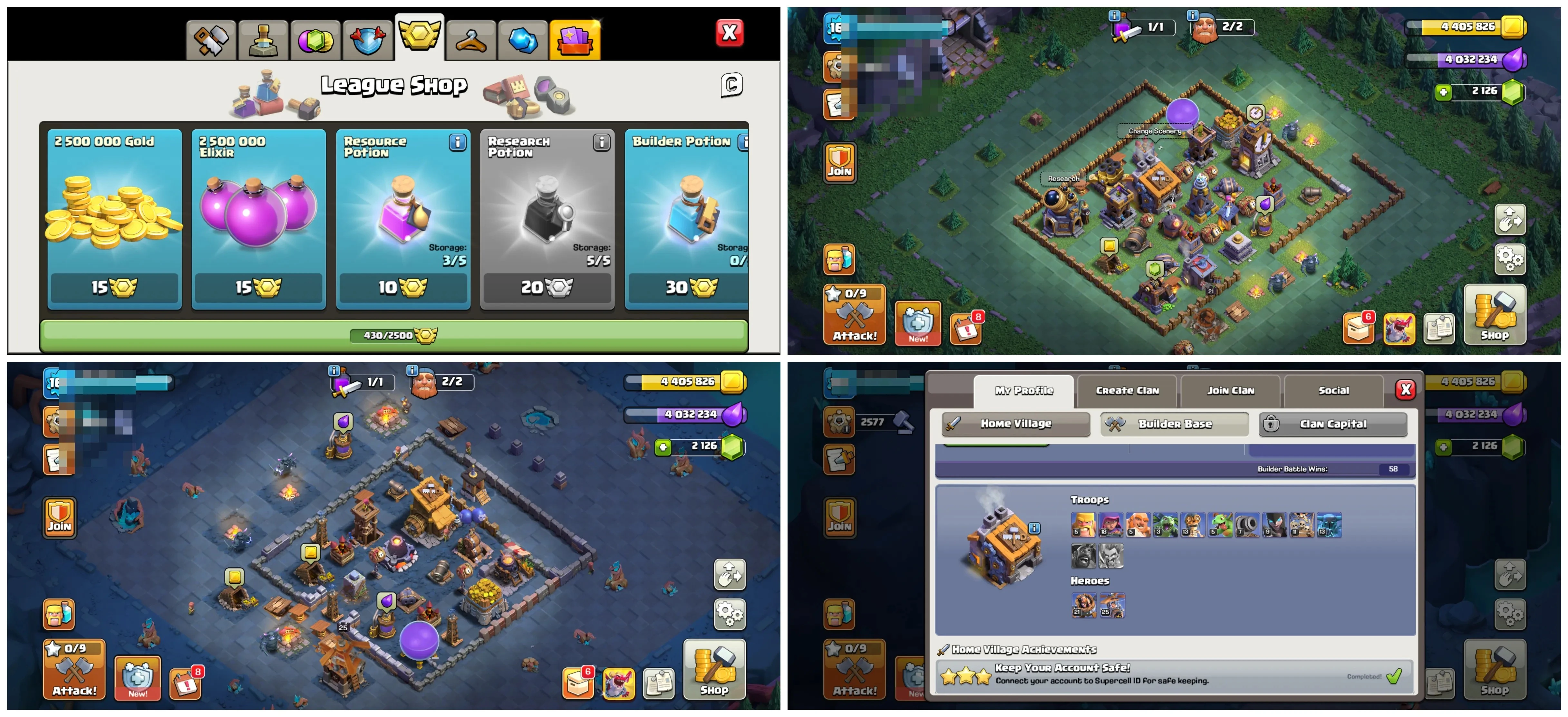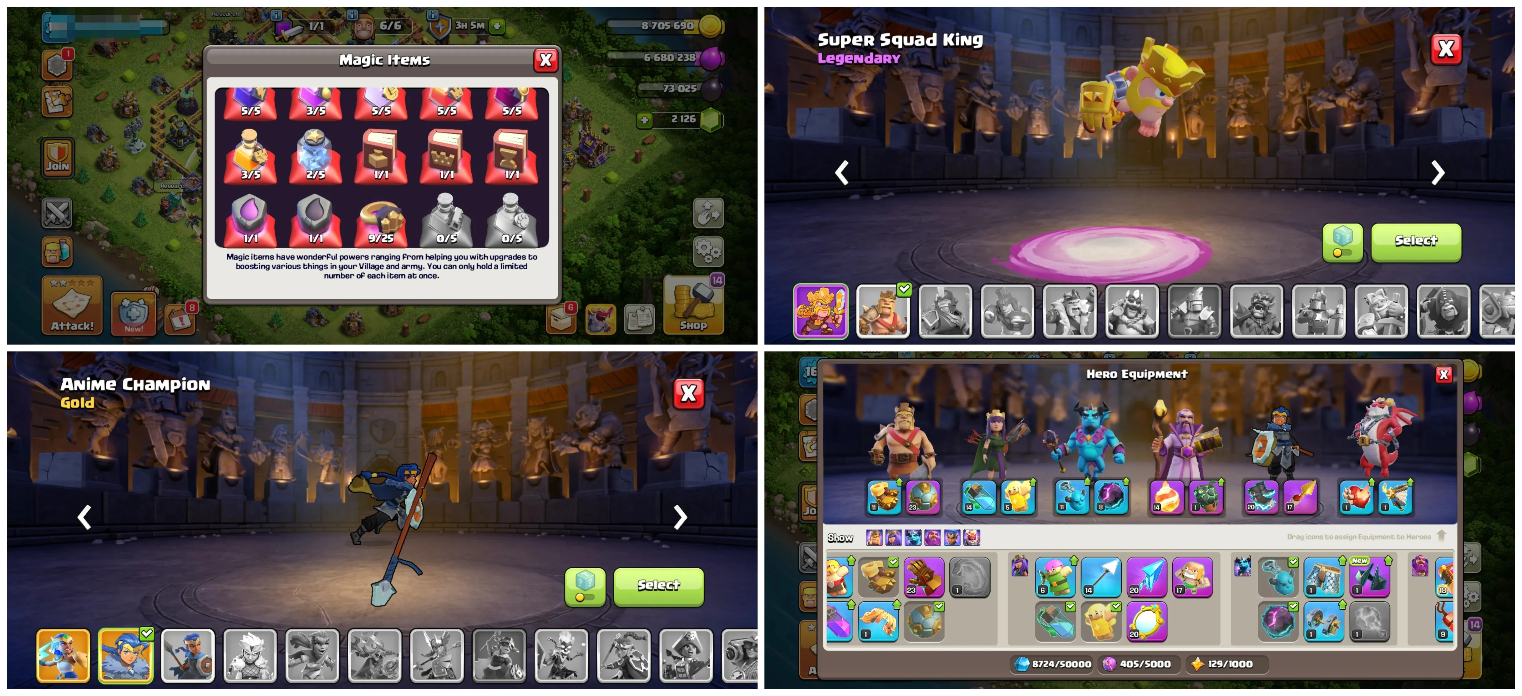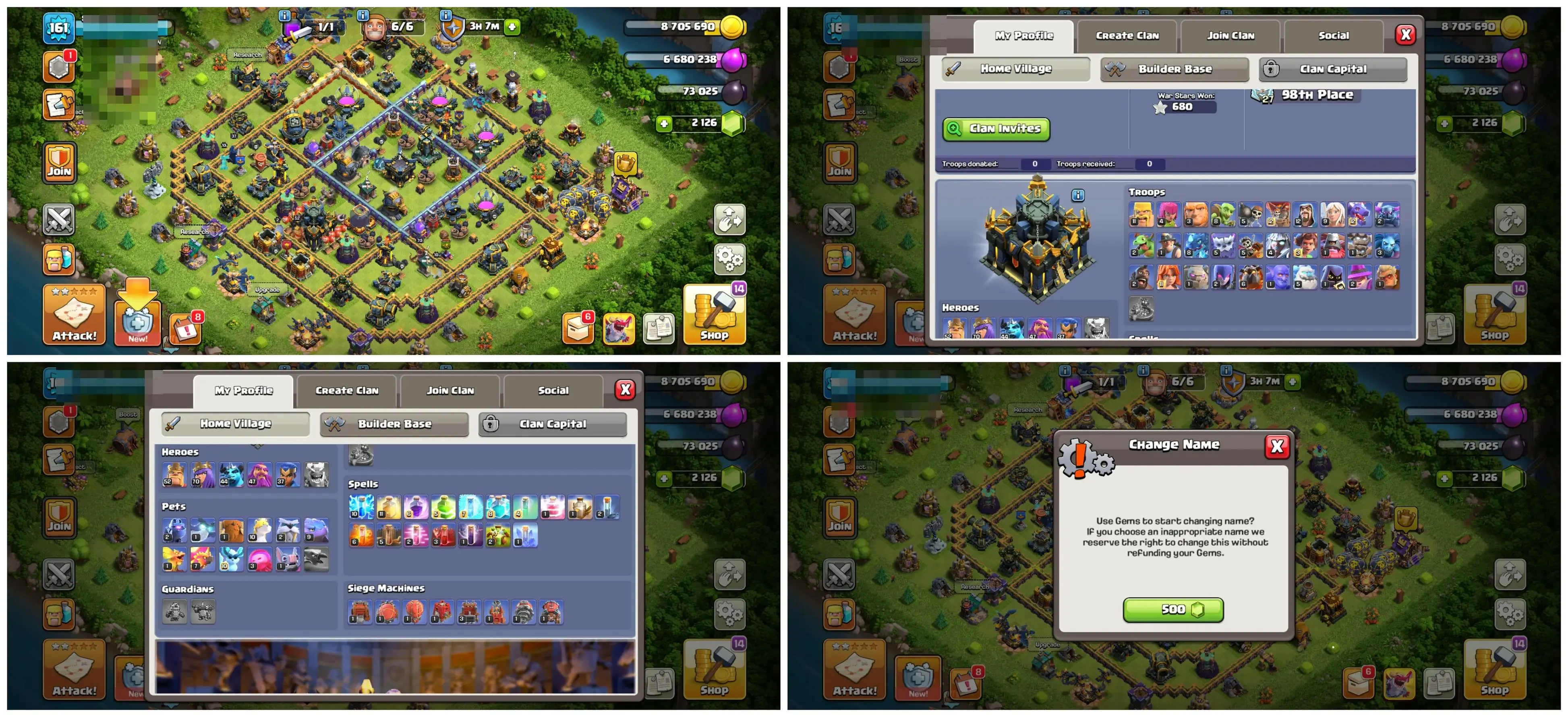 🏰 TH17 🏗️ Semi Max | 💎 2,126 Gems | 📈 Lvl 161 | 🦸♂️ Heroes 52/70/44/47/37 | 👕 3 Skins | ⚔️ 10 Epic Eq. | 💰 Nc 500 | 📱 Android/iOS | 🆔 M3767 !MKG016851