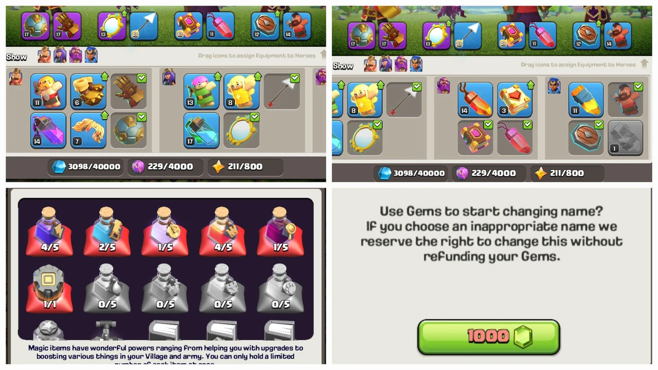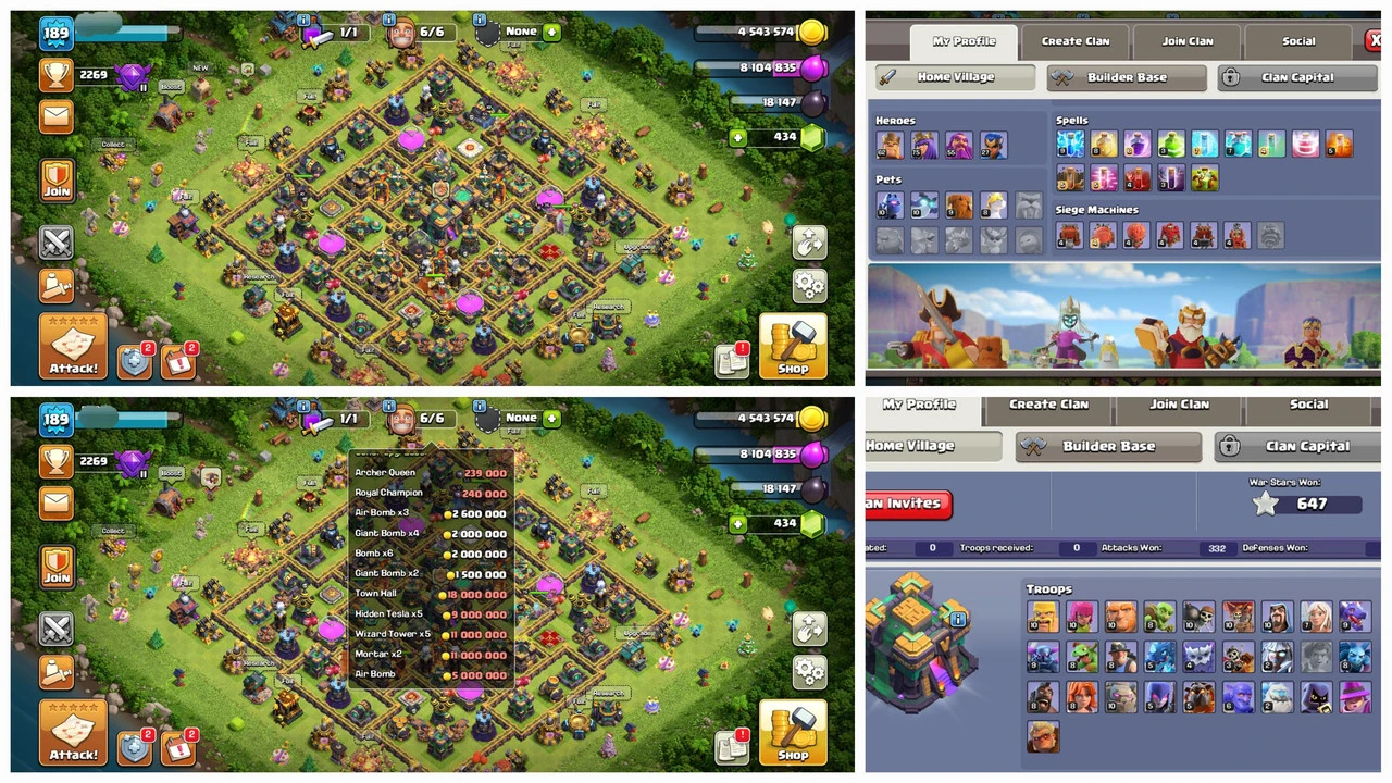TH 14 Near Max Defence & Troop ⚒️ Level 189 💰 Heroes 62_75_55_27 🧿 15 Skin 🔱 3 Epic equipment 🛠️ Nc 1K Gems (Android &iOS) 🏆 M1262