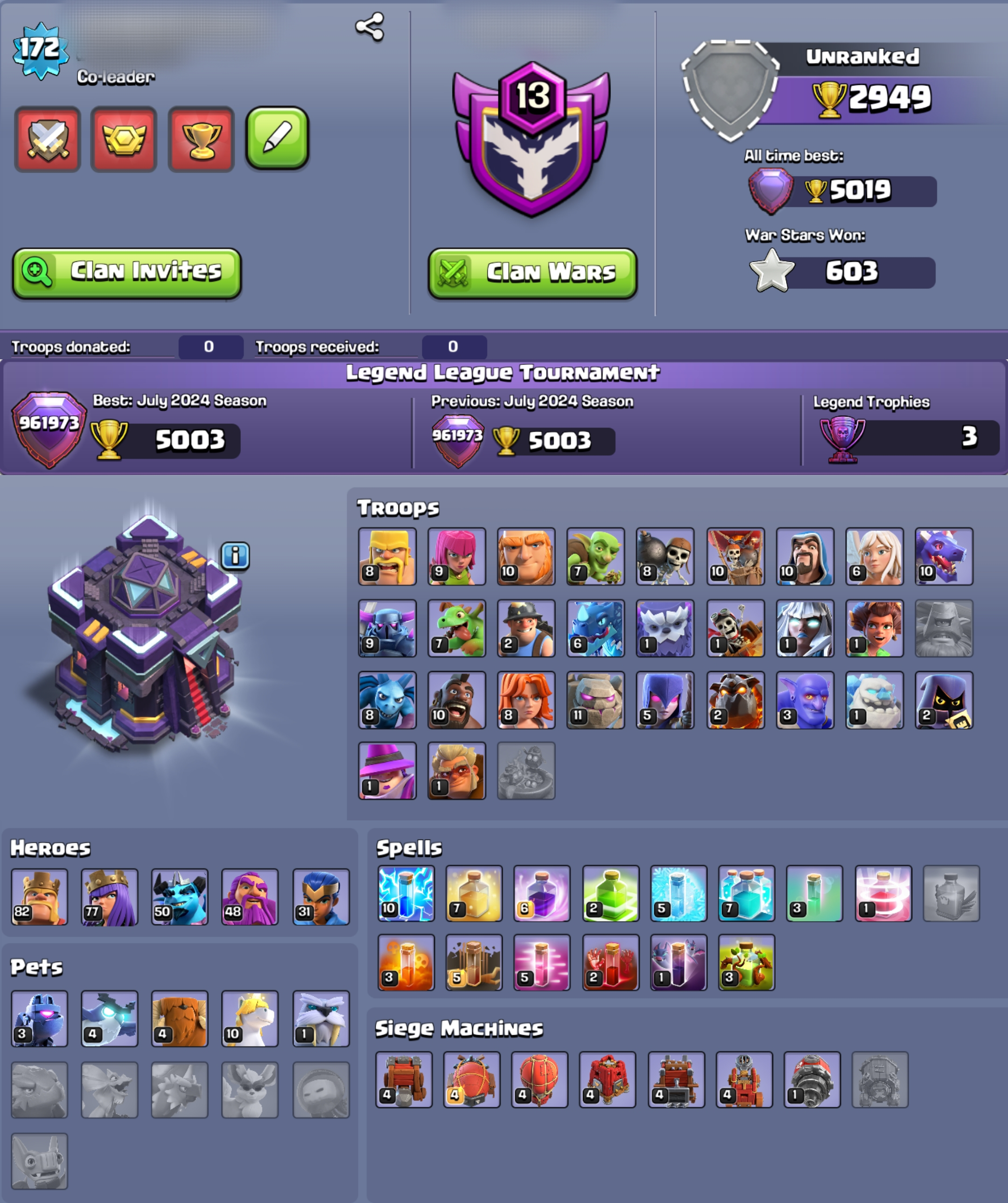 🍀TH 15 SEMI MAX ACC ⭐ 4 EPIC EQUIPMENT 🫧 HEROES 82_77_50_48_31🏅172 XP LVL ♾️ OP MAGIC ITEMS ❤🔥 211 CWL MEDALS 💗 3 OP HEROES SKIN 💎 603 WAR STAR ⭐ SAFE N SECURE 🔐 INSTANT DELIVERY📮