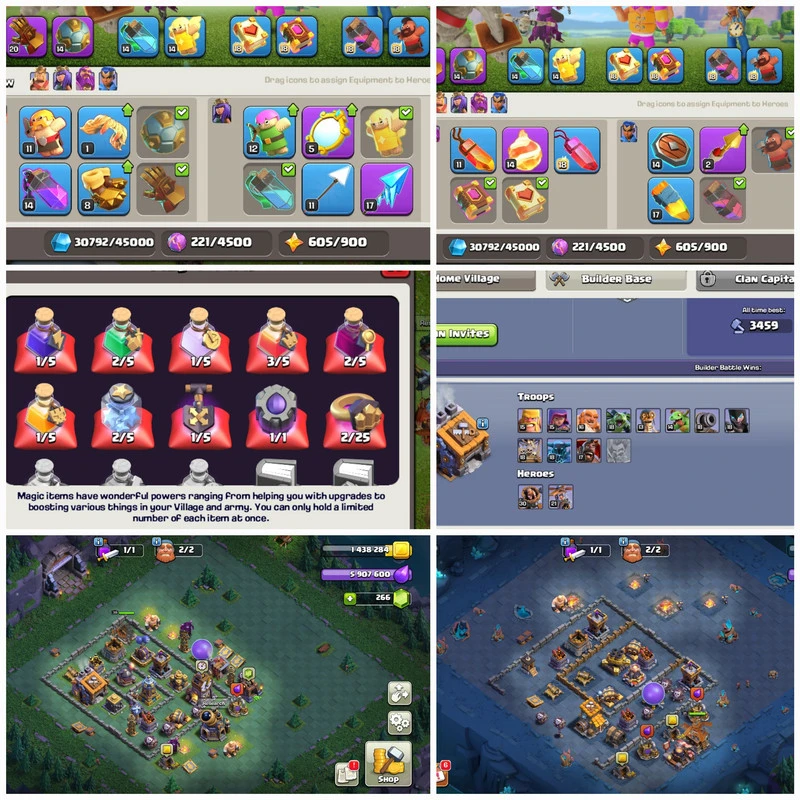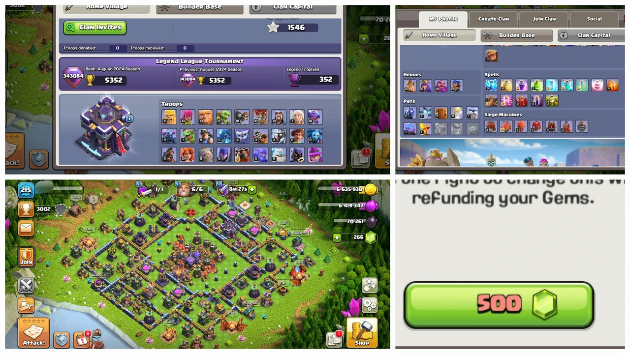 TH 15 SEMI MAX 🪵 Level 215 🧿 Heroes 66_80_39_20 🔮 Gems 266 🔩 10 Skin 📊 6 Epic equipment 🧰 Nc 500 Gems (Android &iOS) 🪓 M1408