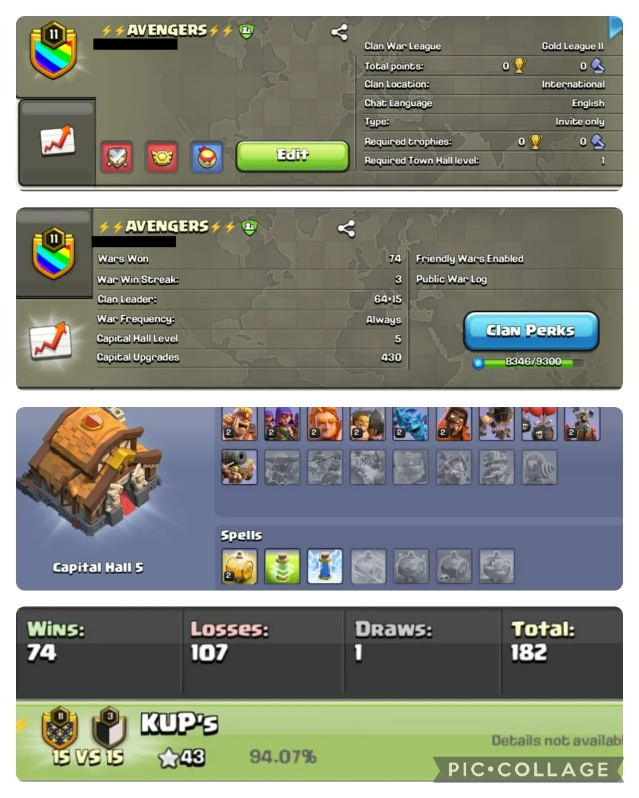 🔥NAME- ⚡⚡AVENGERS ⚡ ⚡| LVL ALMOST 12🥵| 💥WARLOG W/L/D:74/107/1 | CWL League: GOLD 2🏆| CC: 5 !!💥
