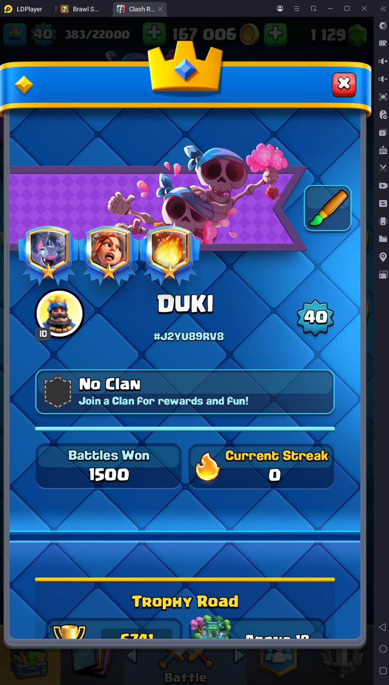 6741 TROPHY 🏆 40 LVL 💯 KT 13 👑 109 CARDS ♦️ EMOTE 20 🎭 #J2YU89RV8 ⸱ TAG ACCOUNT ♥️
