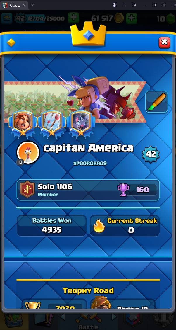 7030 TROPHY 🏆 42 LVL 💯 KT 14 👑 112 CARDS ♦️ EMOTE 35 🎭 #PG0RGRRG9 ⸱ TAG ACCOUNT ♥️