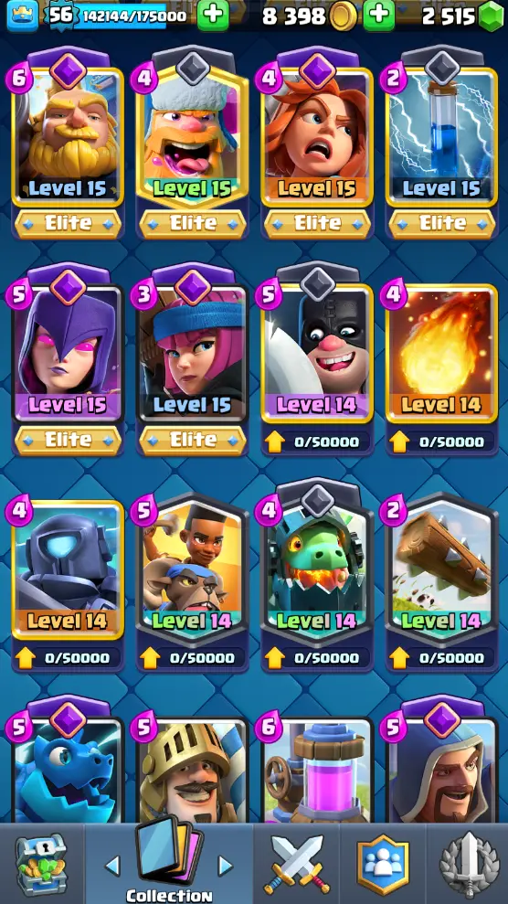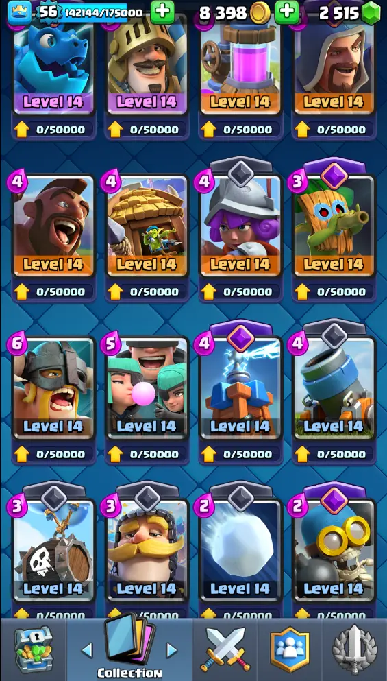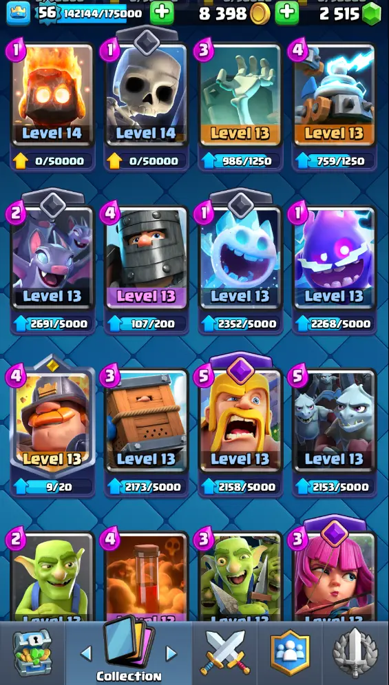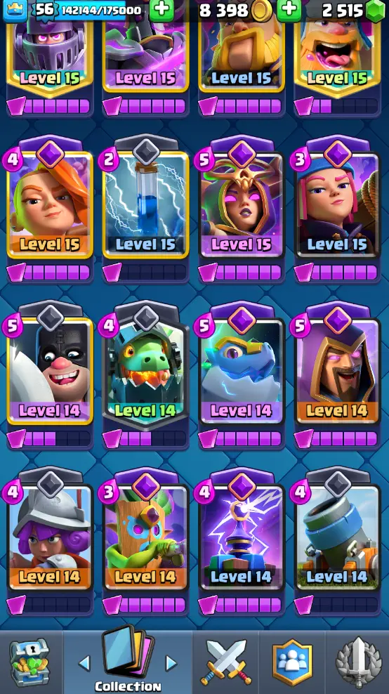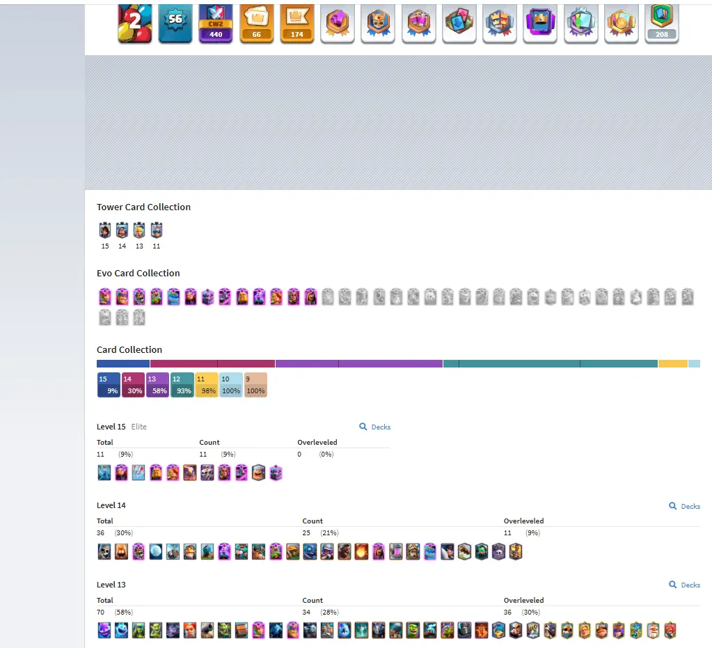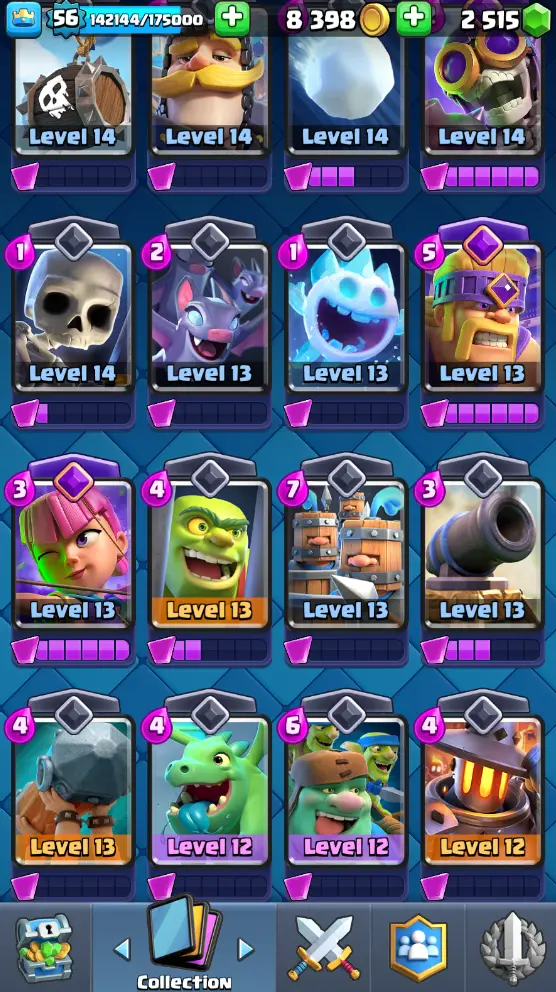 CR Lvl 56 almost 57 ✨ 13500 Trophy ✨ KT 15 ✨ 11 Elite cards ✨ 36 max cards ✨ 13 Evo cards ✨ Stacked inventory ✨ 2500 Gems ✨ 66 emotes ✨ 6 Tower skins
