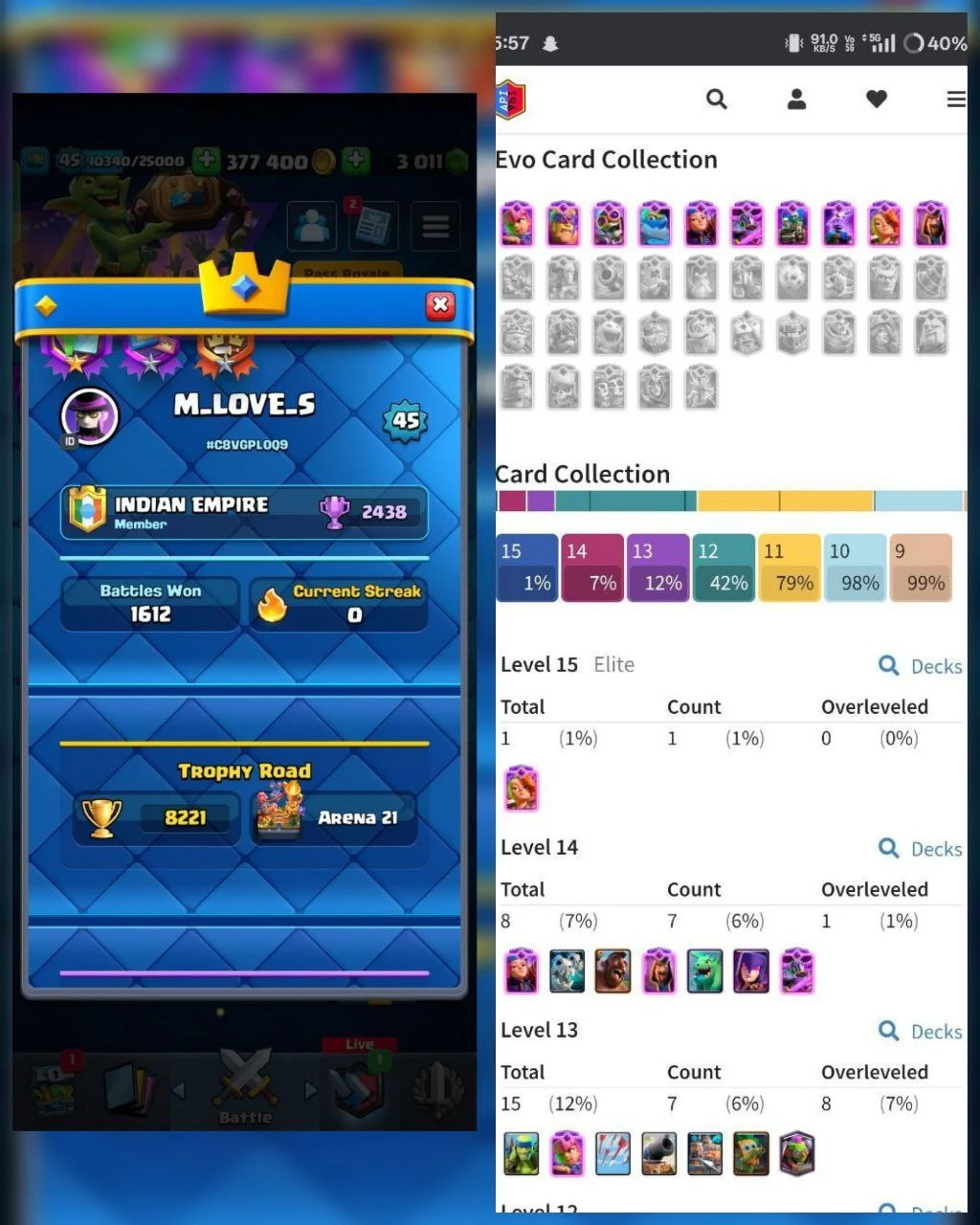 KT LEVEL 12 | XP 45 | 1 Elite 7 Maxed Cards | 377k Gold 3011 Gems | HTrophies: 8221 | Android & iOS | Primium Account | + 10K Gems Almost max Th13 Free
