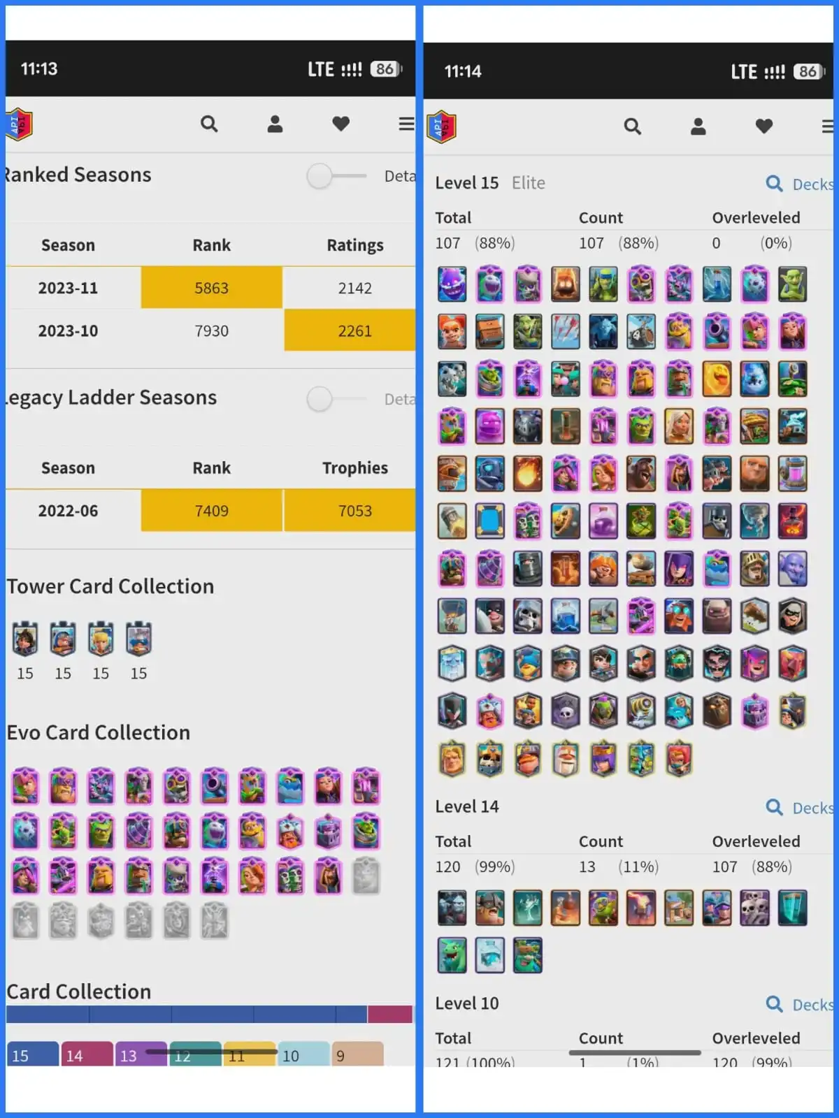 Legendary CR Account 👑 | Fully Upgraded 💥 King Tower 15🥇Level 70 🎗️Current 11000 Trophies 🏆| 120 Max, 107 Elite & 29 Evo Cards 🔥 | Rare Emotes 😎 & Banners 🎌 ✨Name Change Gems Available⚡YAFP MU