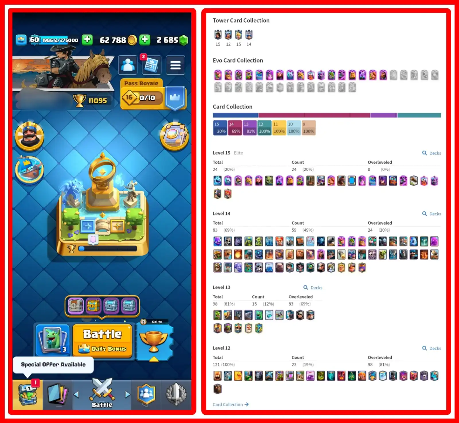 LEVEL 60 🚀😍 11095 TROPHIES 🏆 SEASONAL ARENA LEVEL 2 ❤ KT LEVEL 15 ☠ 17 EVOLUTION CARDS 🤩 24 ELITE CARDS 😍 83 MAX CARDS ☠🎁 FREE NAME CHANGE 💎☠ CHEAP PRICE 💸 INSTANT DELIVERY ☑💯 ANDROID & IOS ☑🤝