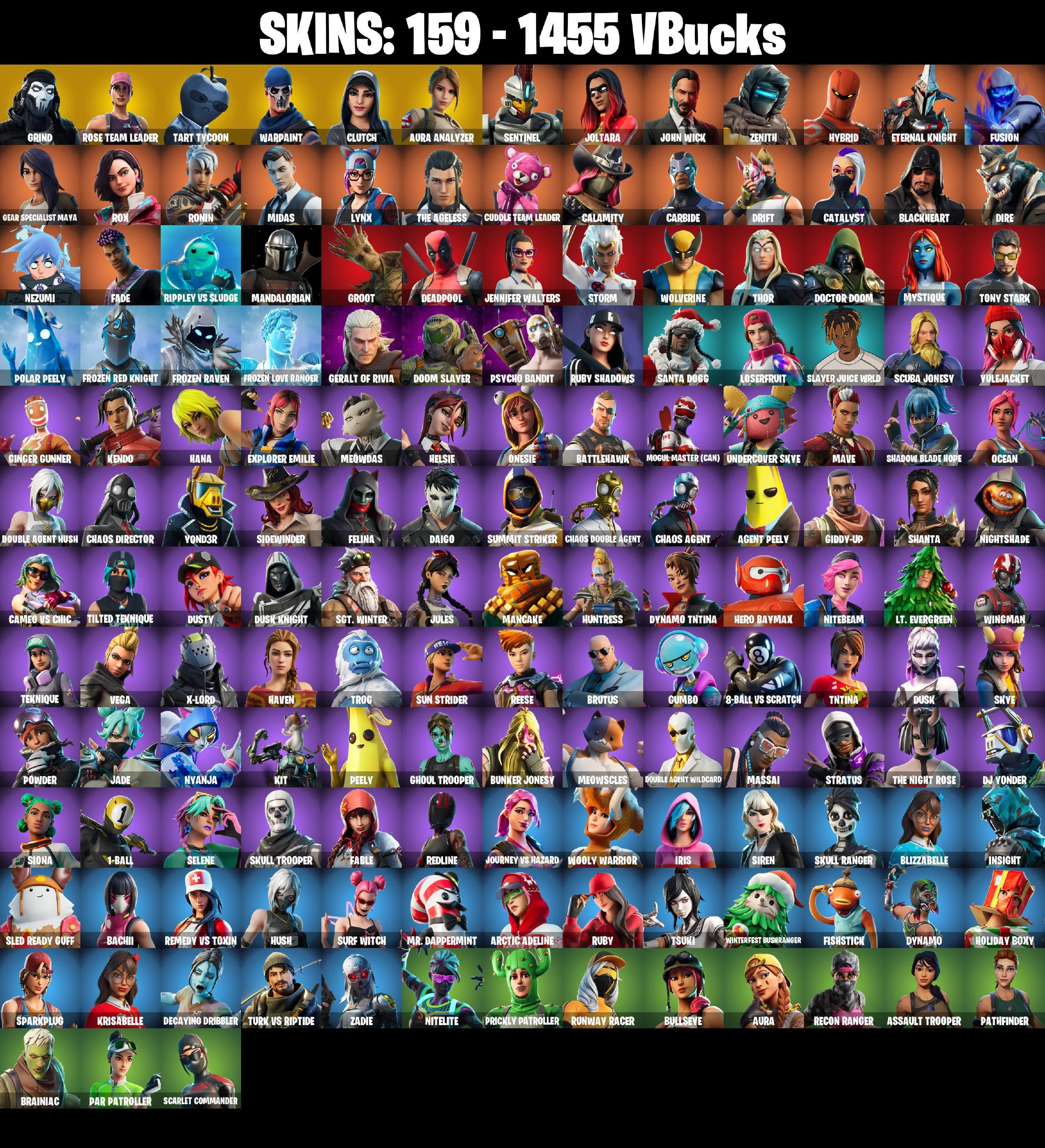 🎆159 SKINS ⚡️PC/PSN⚡️ GRIND 👑 TART TYCOON 👑 CLUTCH 👑 AURA ANALYZER 👑 SENTINEL 👑 JOLTARA 👑 JOHN WICK 👑 ZENITH 👑 HYBRID 👑 ETERNAL KNIGHT ⚡️ 1455 VB #M629