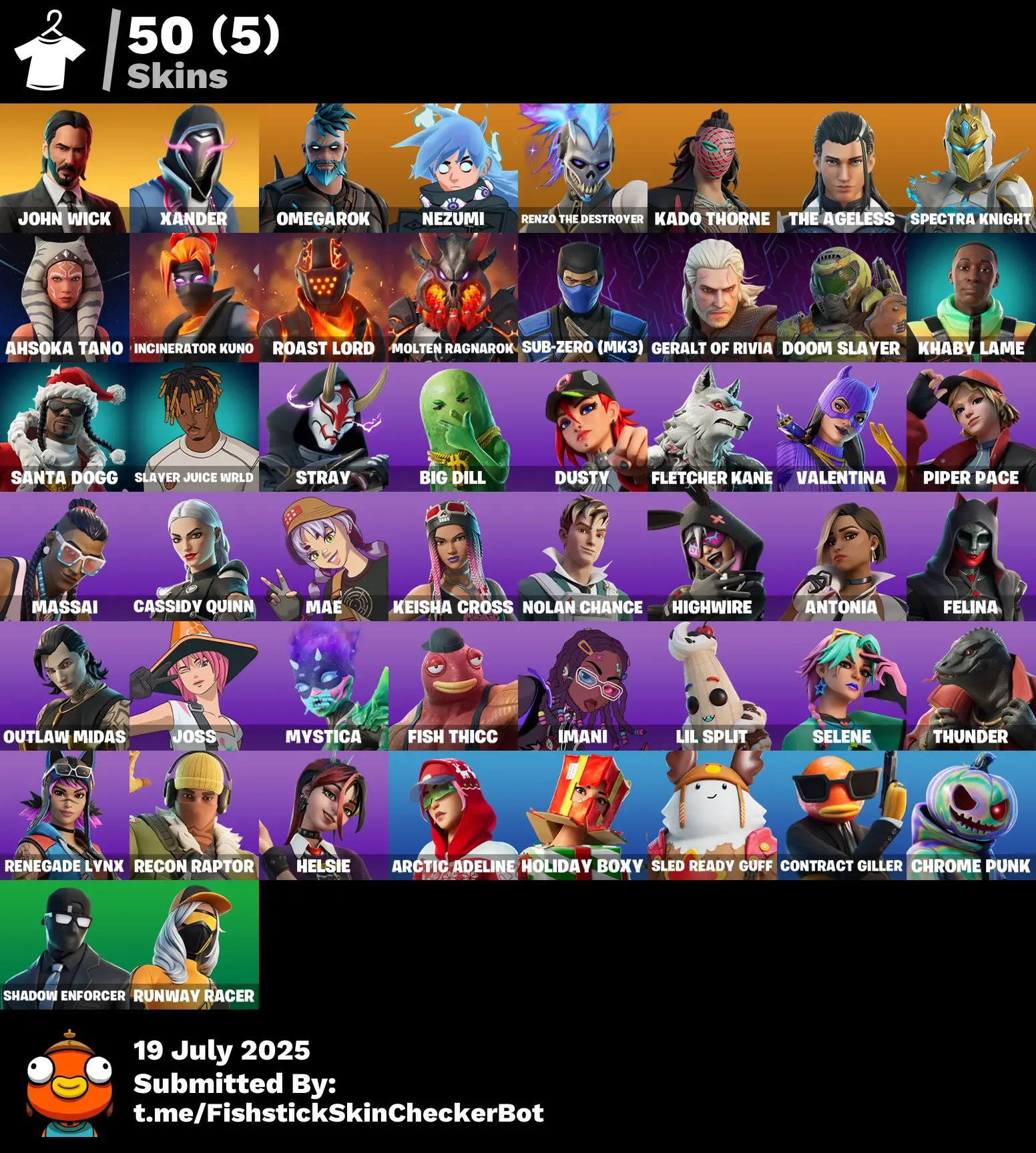 ๐ 50 Skins [PC/PSN/XBOX] ๐ถ๏ธ John Wick ๐ซ Xander โ๏ธ Omegarok ๐ Nezumi ๐ฅ Renzo the Destroyer ๐ฐ Kado Thorne ๐ก๏ธ Spectra Knight ๐ช FTN123