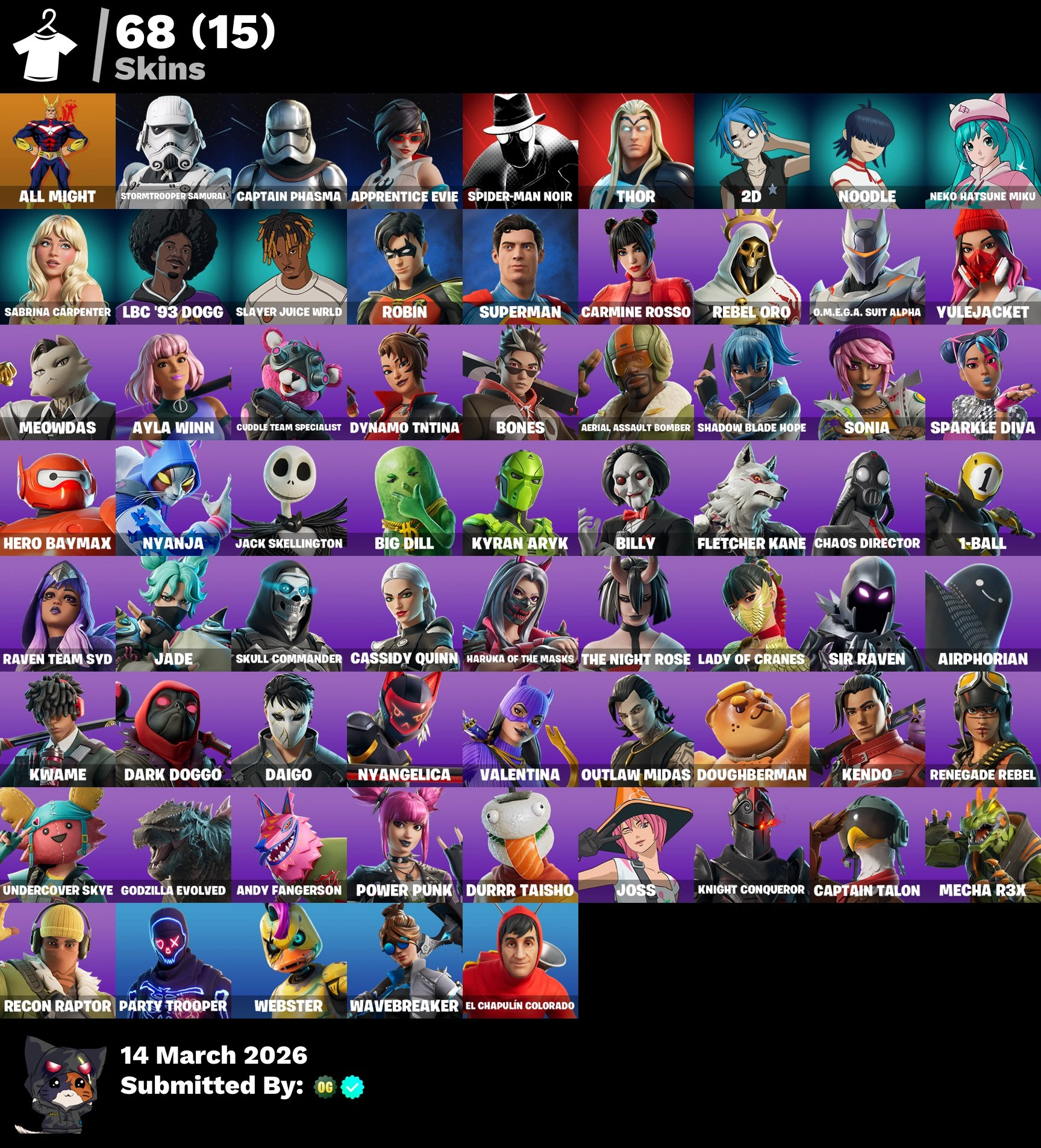 💜68 SKINS💜PSN XBOX NINTENDO PC💜2300-vBUCKS💜 EL CHAPULIN COLORADO📌WEBSTER✅CAPTAIN TALON📌2D NOODLE SABRINA CARPENTER✅CARMINE ROSSO📌SPIDER-MAN NOIR✅AYLA WINN