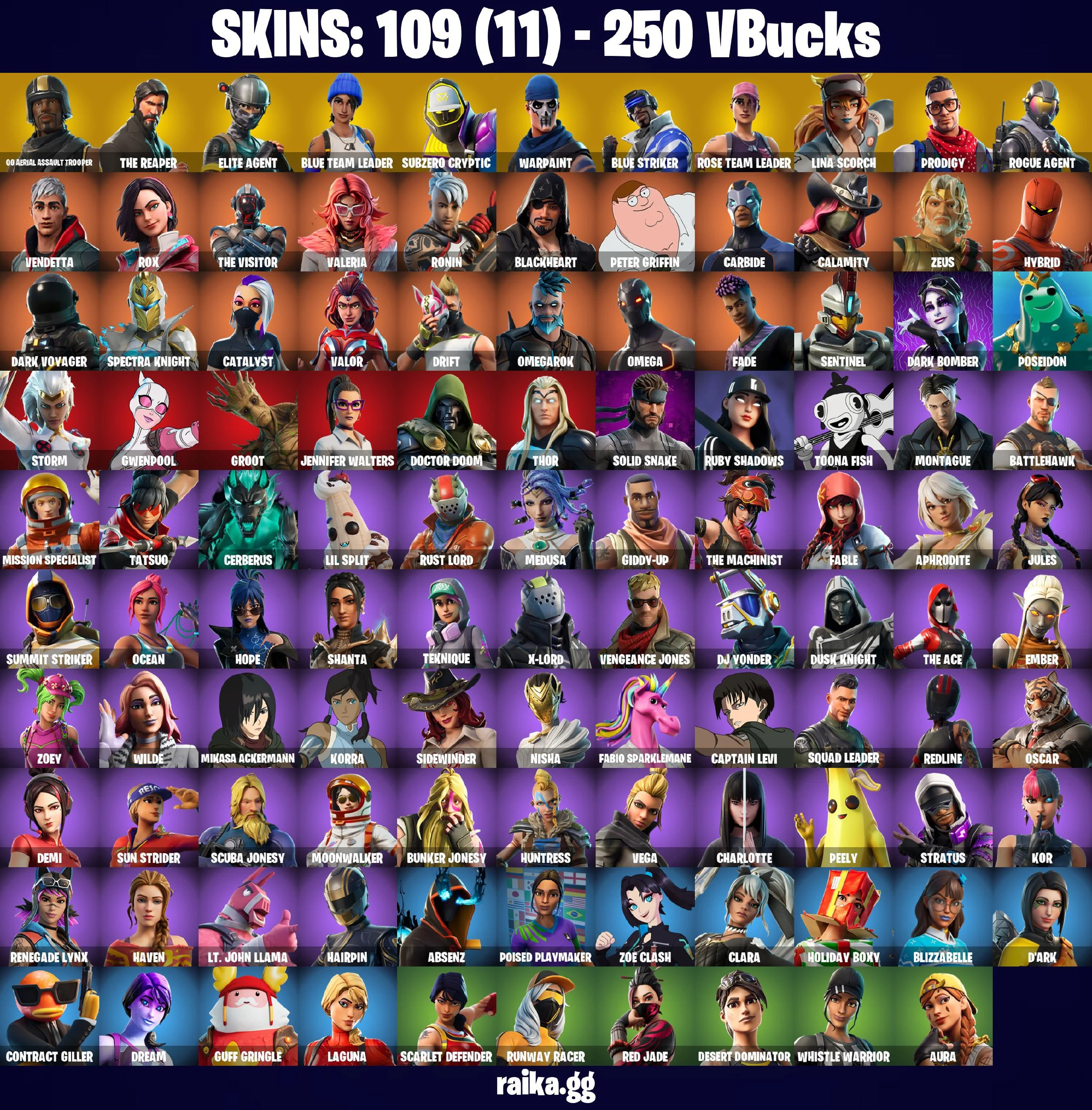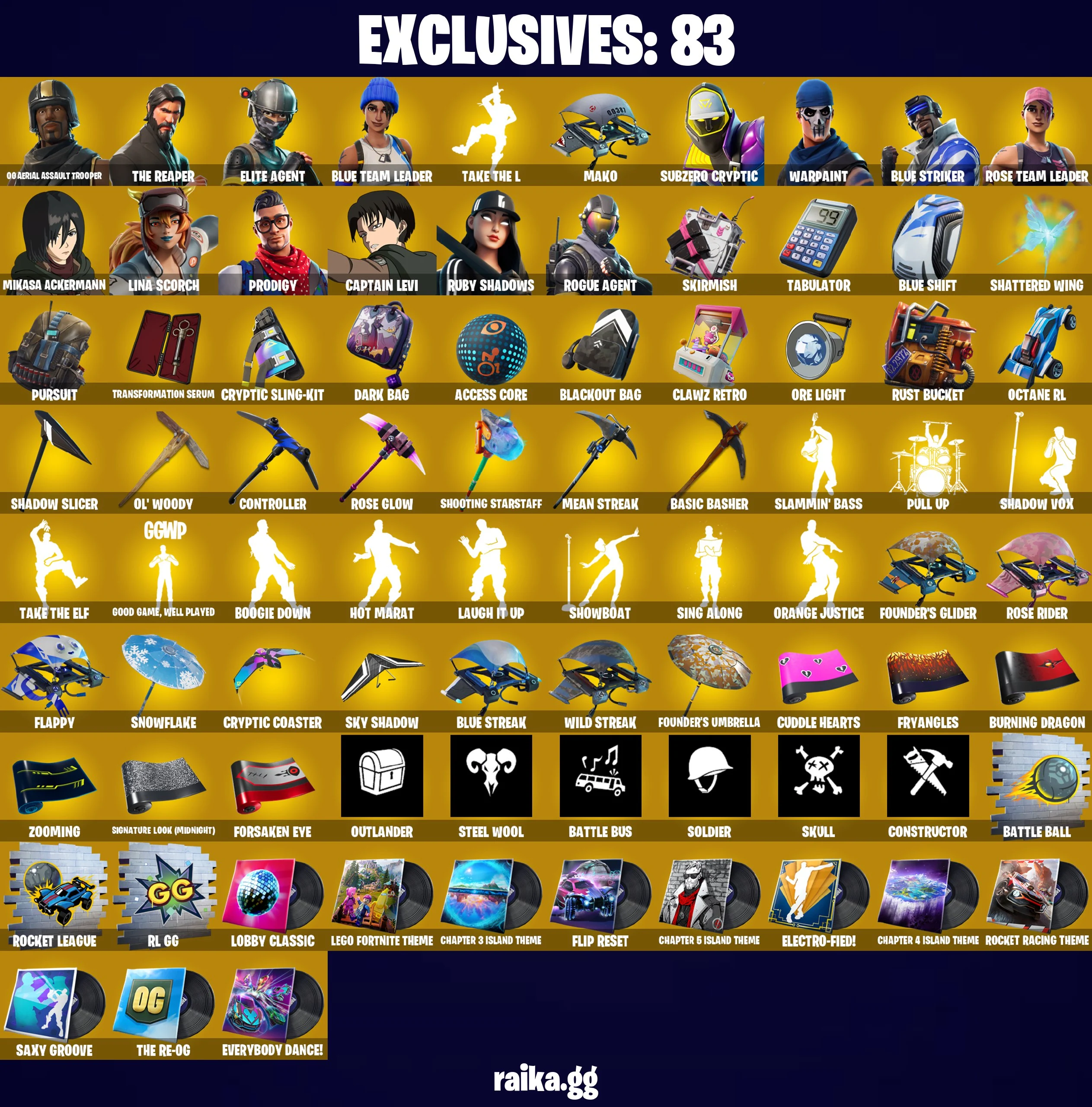 π₯𧨠OG ACCOUNT π§¨π₯ OG AERIAL ASSAULT TROOPER π 109 skins π OG STW π The Reaper π Elite Agent π Blue Team Leader π Subzero Cryptic π Blue Striker π Lina Scorch π Prodigy π Rogue Agent π Skirmish π Tabulator π Full Access π PC\PSN\XBOX\SWITCH π