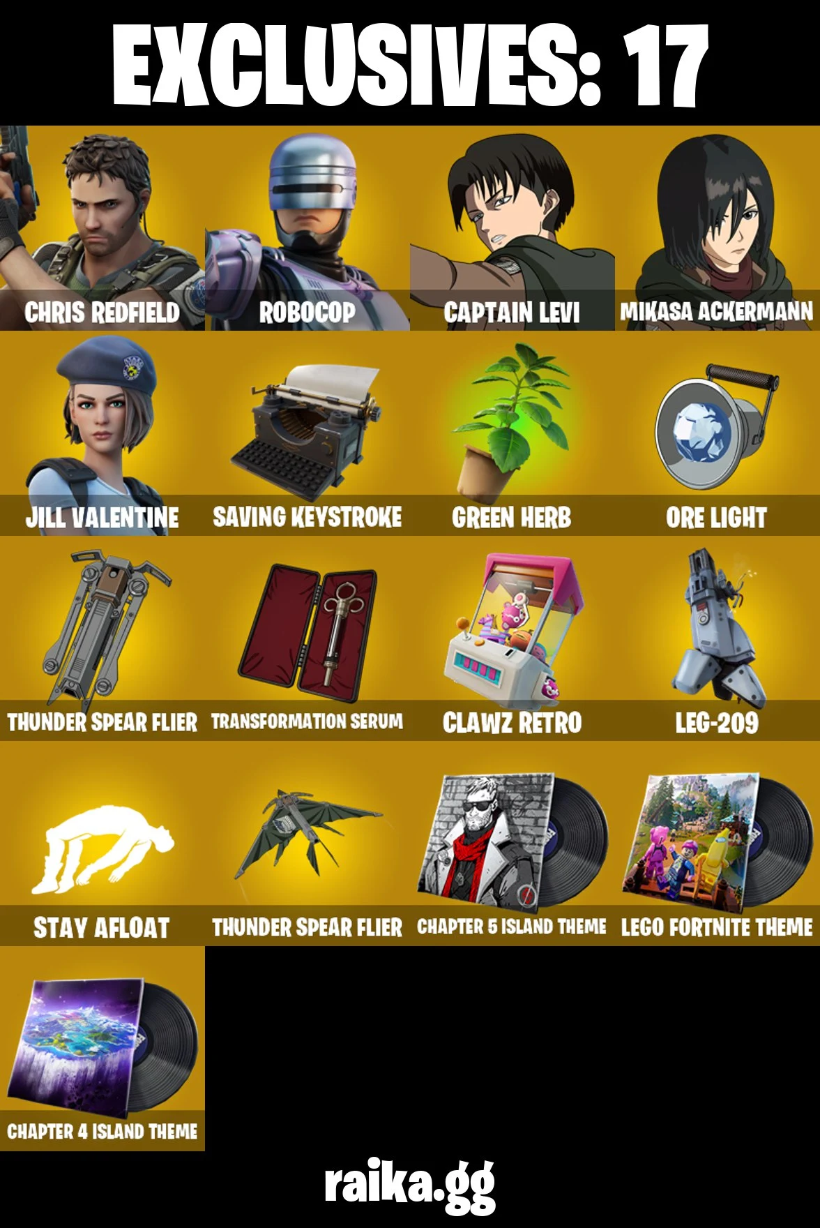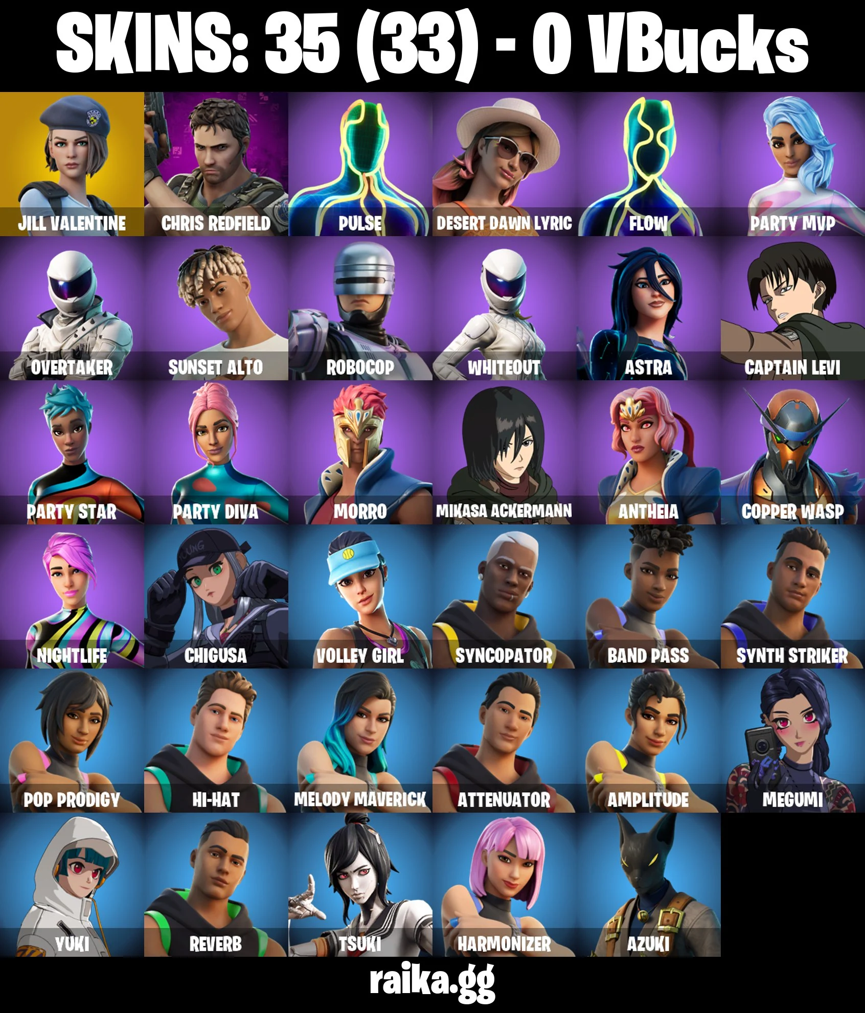 Original Email ✅ Inactive for 3 years | Captian Levi | Mikasa Ackermann | 35 skins | Jill Valentine | Chris Redfield | Pulse | Desert Dawn Lyric | Flow | Party MVP | Overtaker | Sunset Alto | RoboCop | Whiteout | Astra | 0 VB