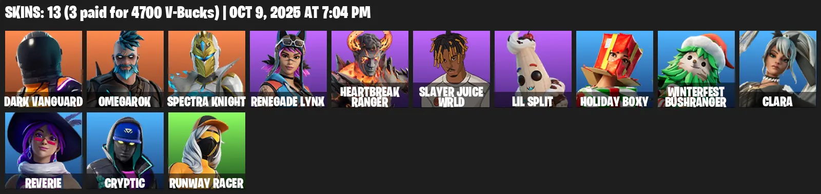 [PC/PSN] | 13 skins | Reaper Axe | Dark Vanguard | Omegarok | Spectra Knight | Renegade Lynx | Heartbreak Ranger | Slayer Juice WRLD | Lil Split | S4G