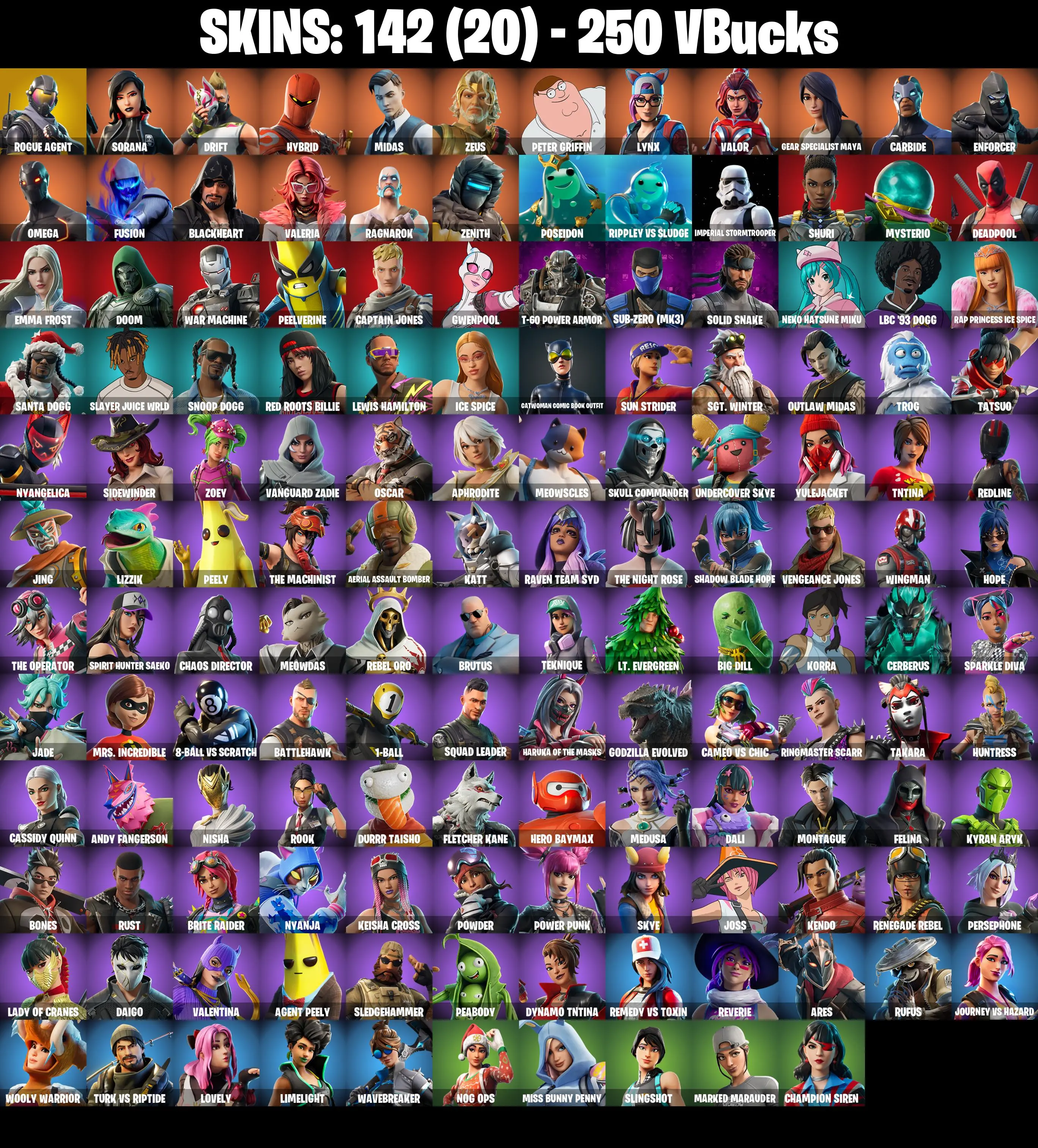 PC/PSN/XBOX ♨️142 skins ✨ Deadpool ✨ Omega ✨ Orange Justice ✨ Rogue Agent ✨ Drift ✨ Carbide ✨ Rage ✨ Ragnarok ✨ Peely ✨ Fusion ✨ Midas ✨ Lynx ✨ #B872