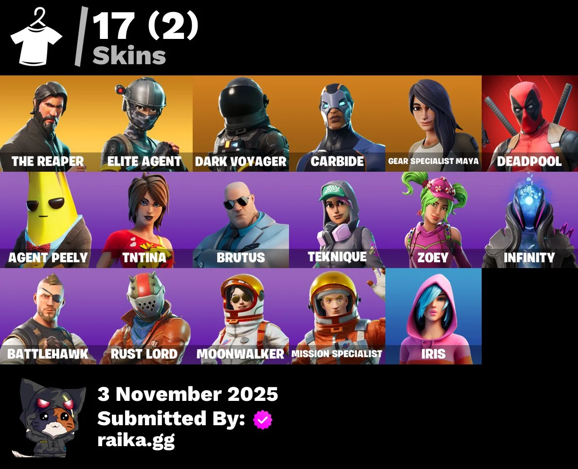 [PC/PSN/XBOX] 17 skins | The Reaper | Elite Agent | Dark Voyager | Carbide | Gear Specialist Maya | Deadpool | Agent Peely | TNTina | Brutus | Teknique | 250 VB