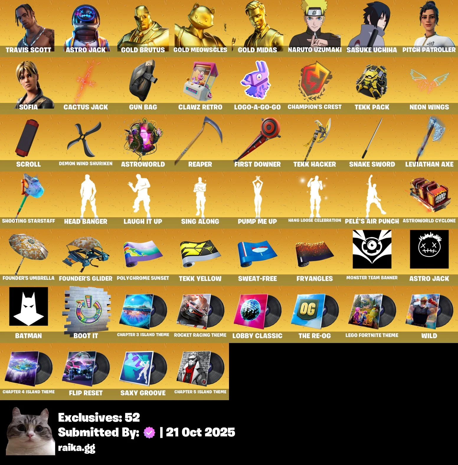 [PC/PSN/XBOX] 206 skins | OG STW | Travis Scott | Astro Jack | Gold Brutus | Gold Meowscles | Gold Midas | Naruto Uzumaki | Pitch Patroller | Sofia |