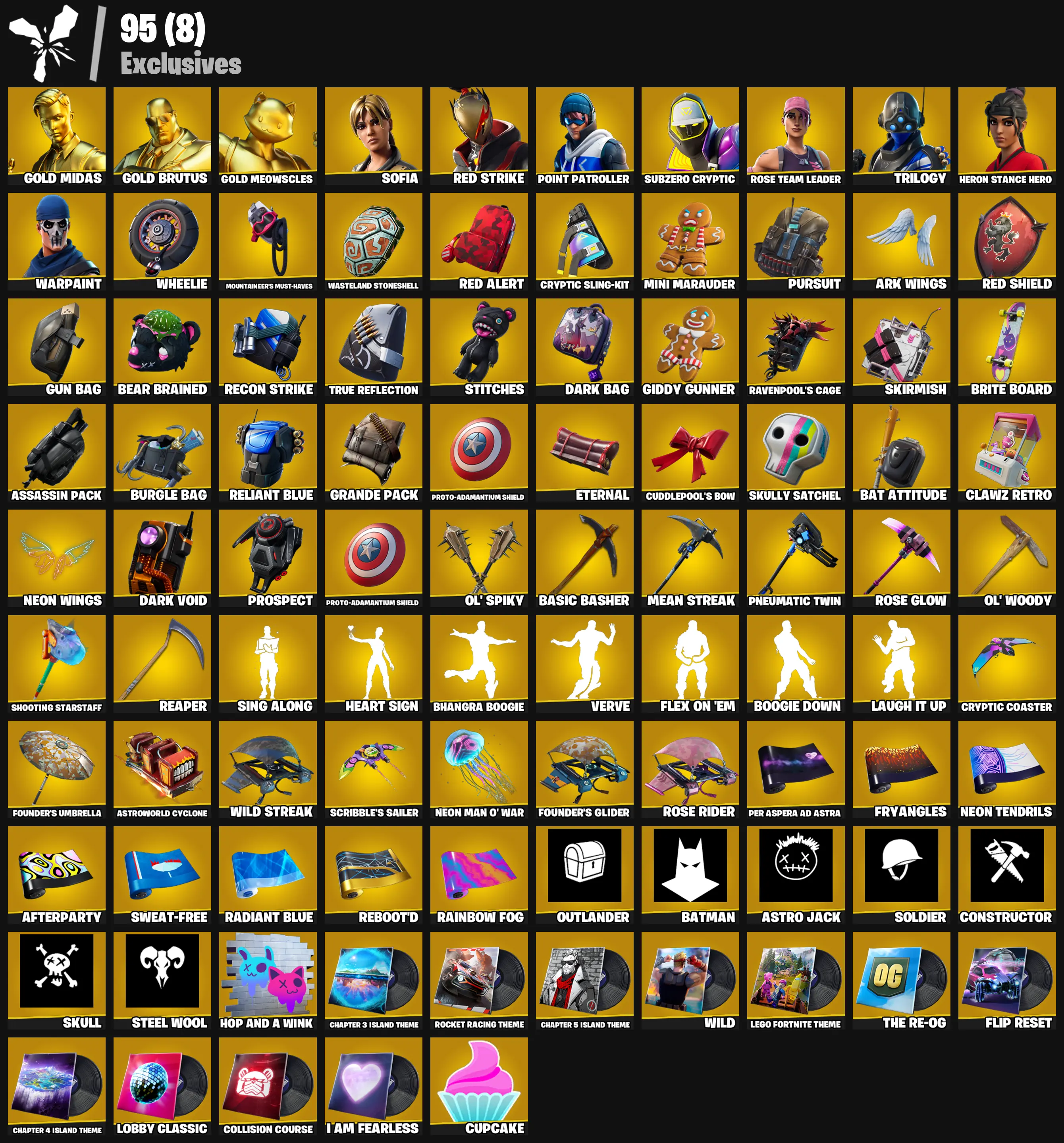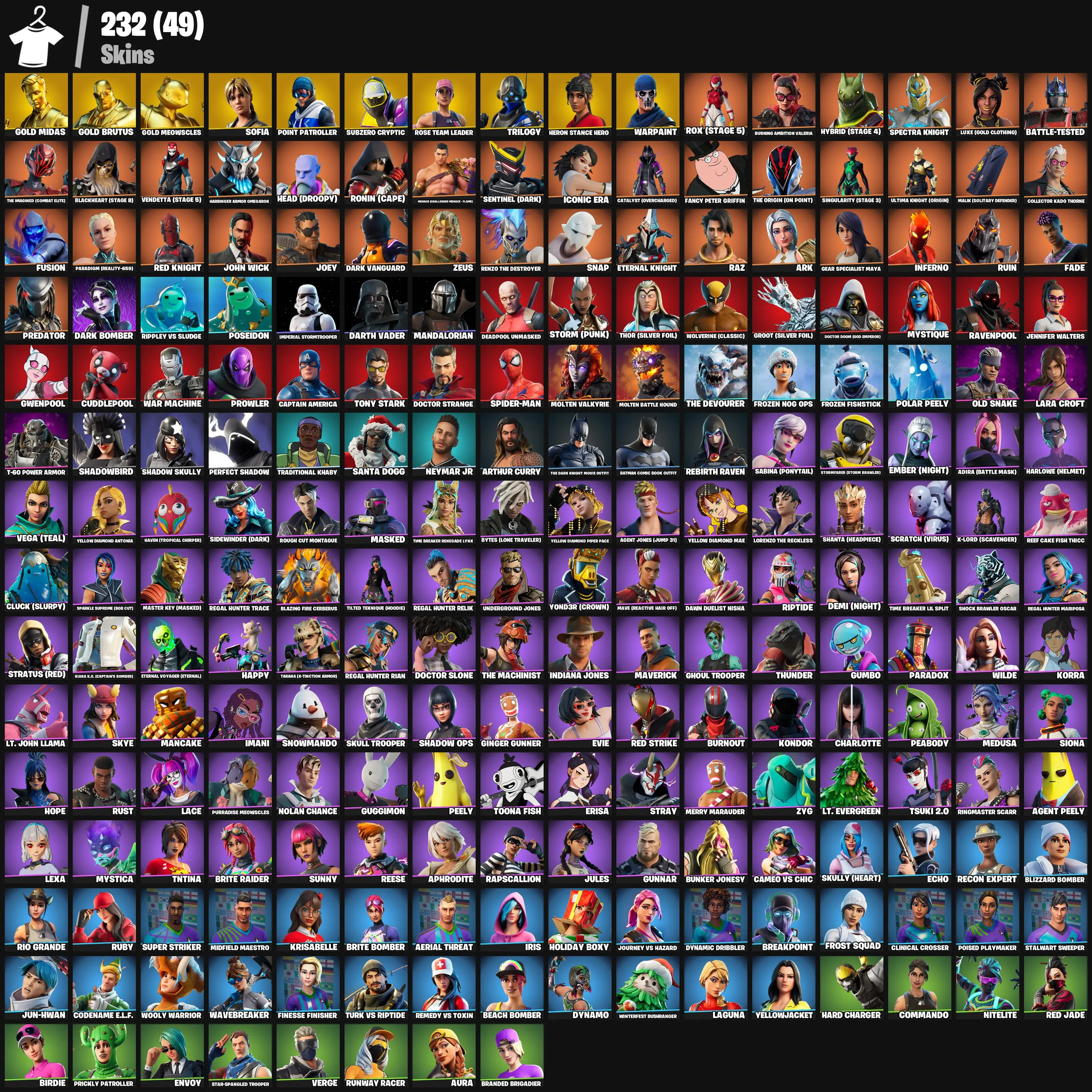 ๐ฏ [PC/PSN/XBOX] 232 SKINS | Sofia, OG STW, Gold Midas, Laugh It Up, Iconic Era, Catalyst, Demi, Predator, Batman, Frozen Fishstick, Skull Trooper, Heron Stance Hero, Tony Stark, Gold Brutus, Gold Meowscles, Lara Croft