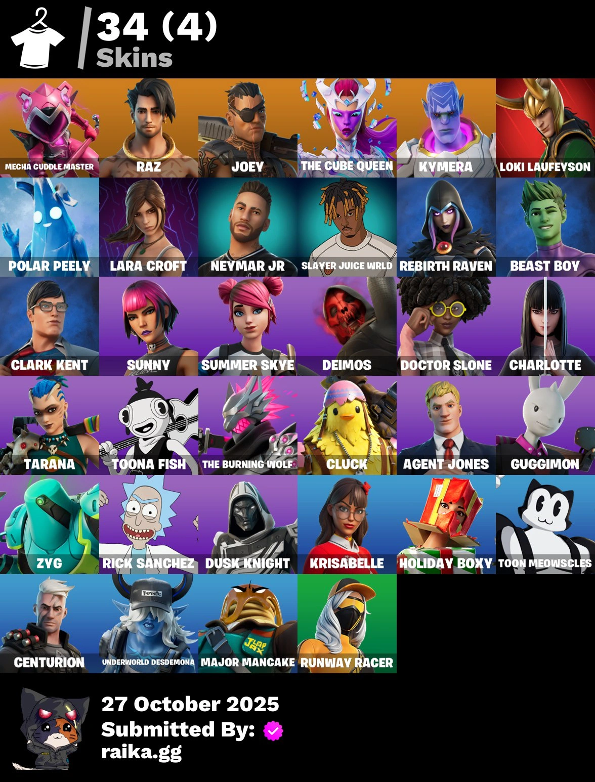 [PC/PSN/XBOX] 34 skins | Mecha Cuddle Master | Raz | Joey | The Cube Queen | Kymera | Loki Laufeyson | Polar Peely | Lara Croft | Neymar Jr | 400 VB