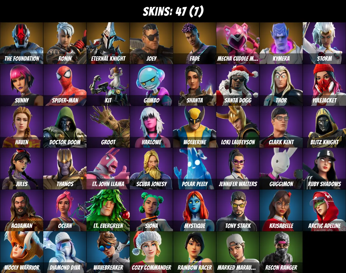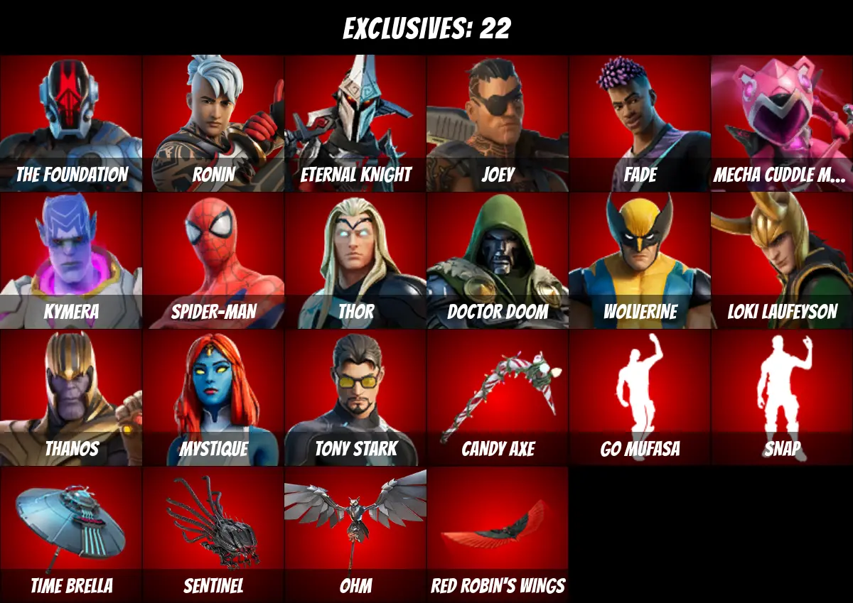 ⚡PC/PSN/XBOX⚡ 47 skins 💎 Candy Axe 💎 Tony Stark 💎 Jules 💎 Go Mufasa 💎 Spider-Man 💎 Thor 💎 Thanos 💎 Wolverine 💎 Mystique 💎 Doctor Doom 💎 Loki Laufeyson 💎 Joey 💎 Fade 💎 Ronin 💎 Kymera 💎 Eternal Knight 💎 Mecha Cuddle Master 💎 The Foundation 💎 750 V-Bucks 💎